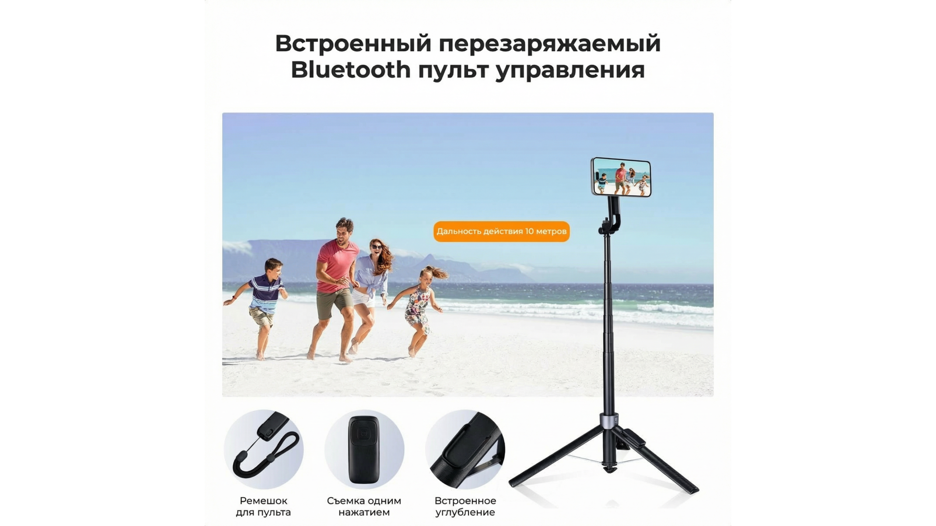 4-осевая головка позволяет мгновенно менять угол съемки. Встроенный съемный Bluetooth-пульт на перезаряжаемой батарее обеспечивает управление на расстоянии. Устройство оснащено устойчивыми ножками (размах 39 см) и телескопической штангой из алюминиевого сплава.