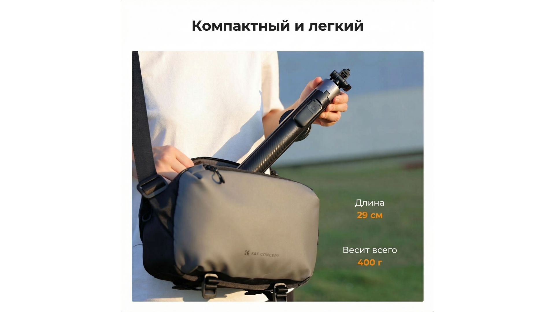 K&F Concept KF15.0015 — это универсальный 3-в-1 аксессуар, который объединяет селфи-палку, штатив и держатель. Благодаря продуманной конструкции он надежно фиксирует смартфон с помощью магнита, зажима или стандартного винта 1/4 дюйма. Монопод оснащен функцией быстрого раскладывания: в сложенном виде его длина всего 29 см, а в рабочем достигает 180 см.