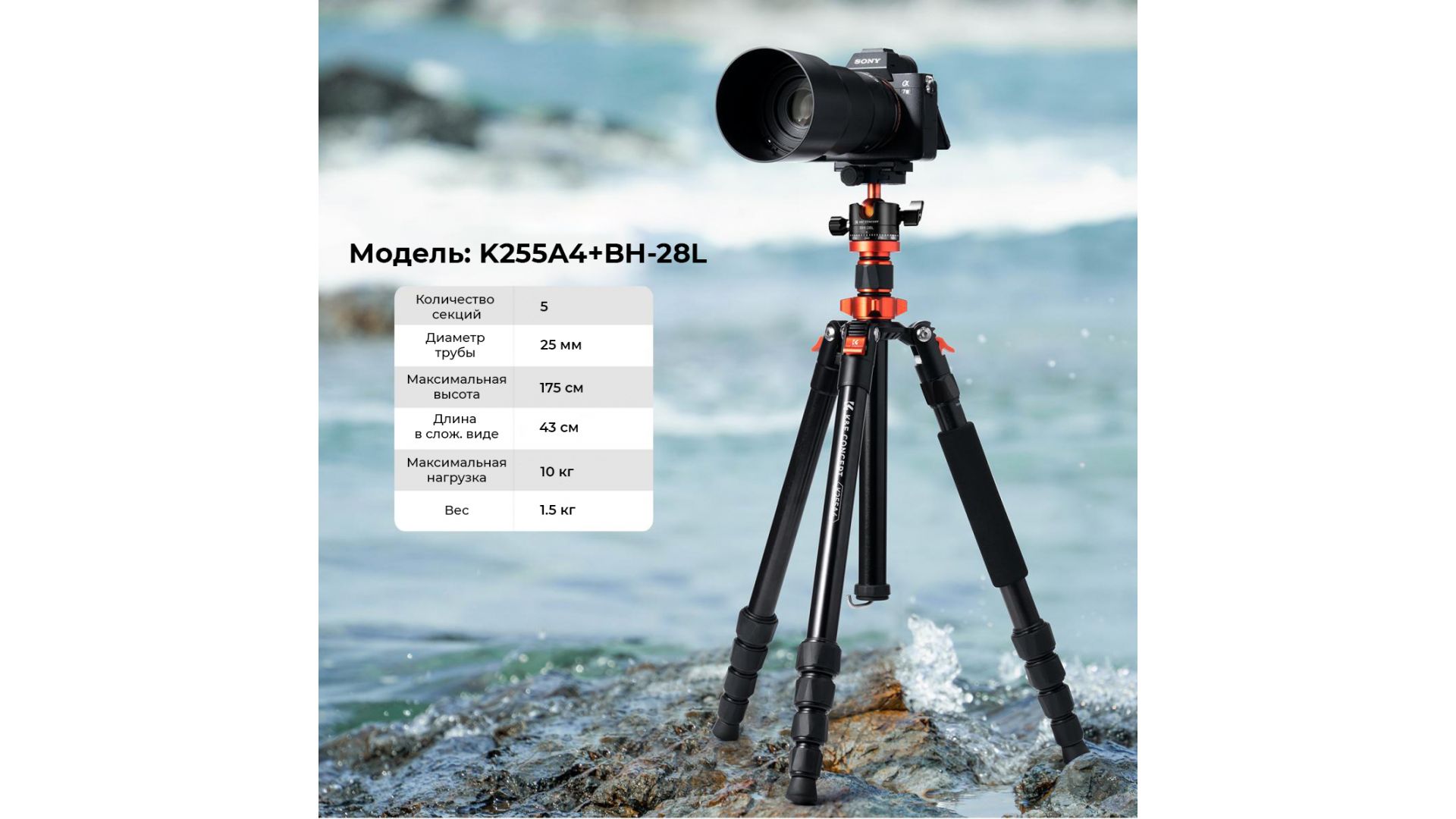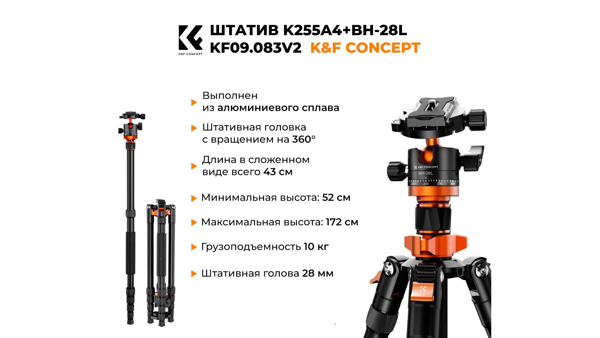 Штатив K&F Concept K255A4 + BH-28L — надёжный аксессуар для фотографов и видеографов, обеспечивающий устойчивую и удобную съёмку.
