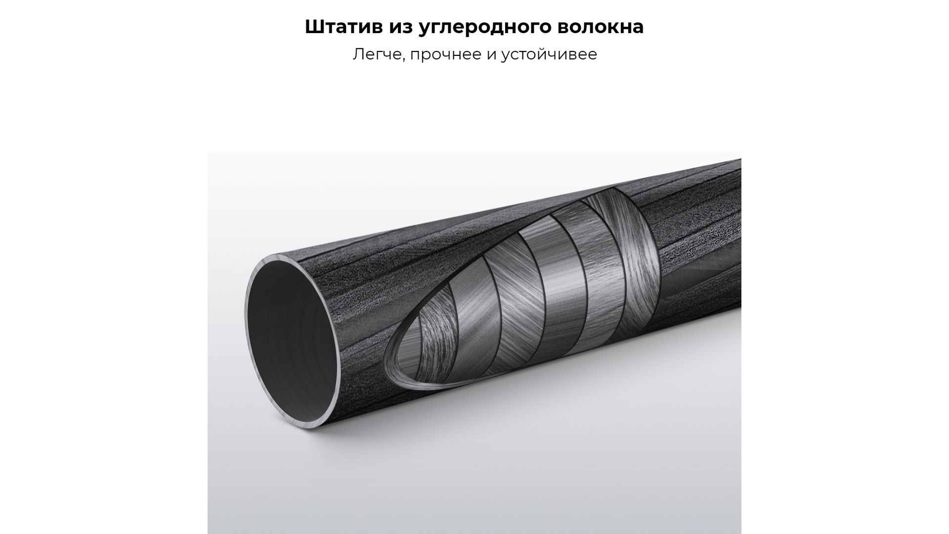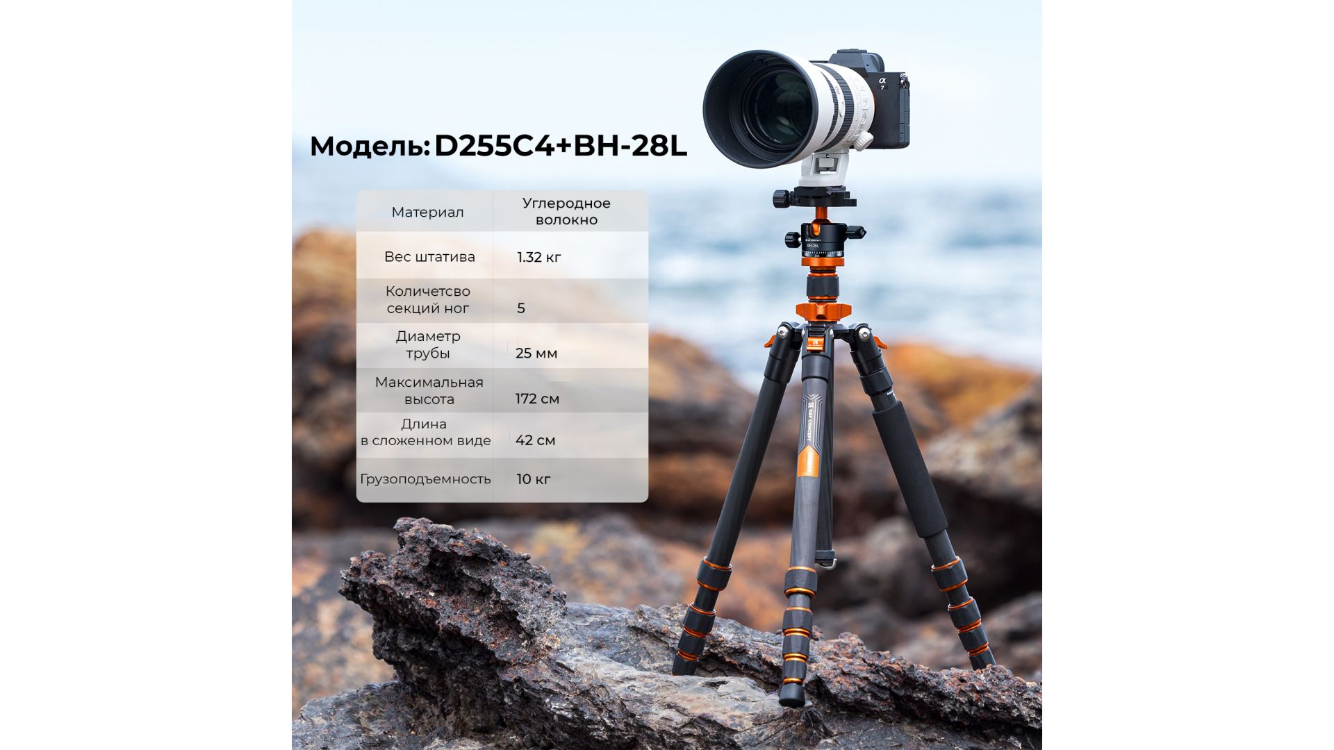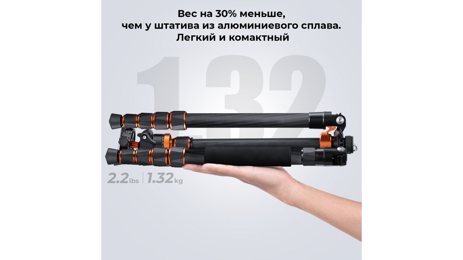 Штатив изготовлен из качественного углеродного волокна, весит всего 1,33 кг, длина в сложенном виде составляет 42 см. Грузоподъемность составляет 10 кг.