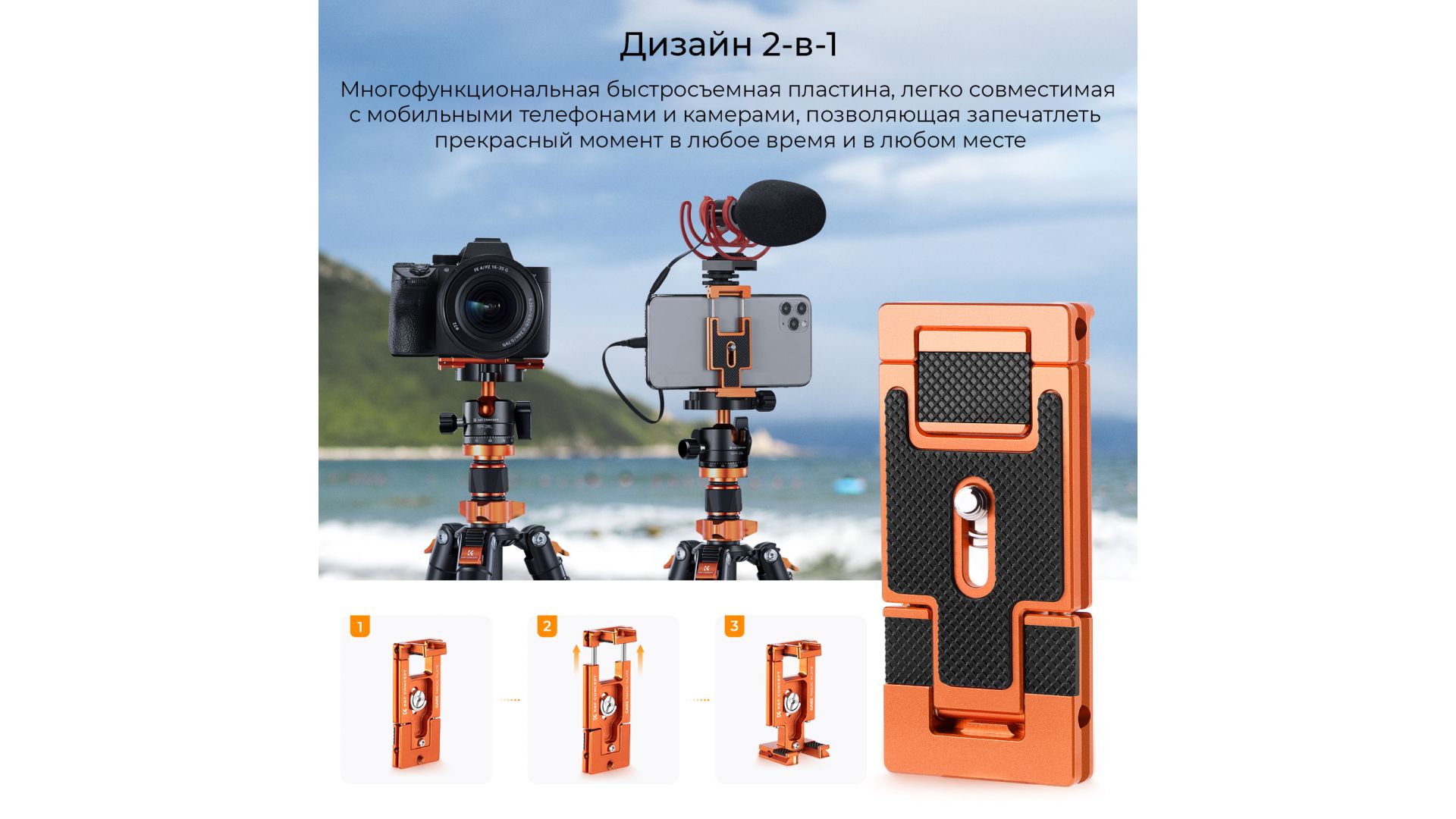 Быстросъемная пластина для штатива имеет двойную функцию для установки не только камер, но и телефонов, что более удобно для вас, чтобы использовать несколько устройств для фотосъемки.