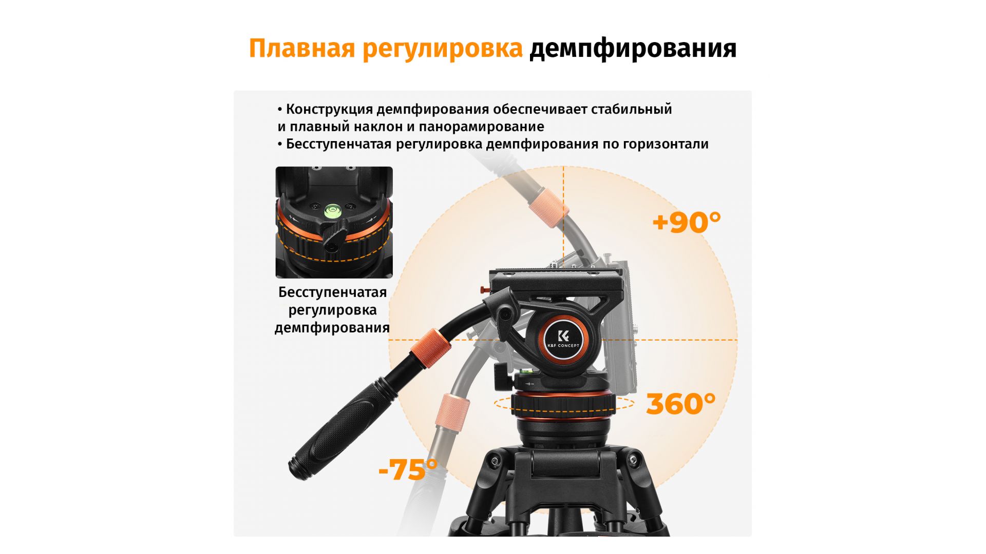 - Профессиональная жидкостная головка обеспечивает плавное перемещение камеры, что подходит для видео и создания точной композиции, обеспечивая стабильность съемки. Панорамная съемка оснащена бесступенчатой регулировкой демпфирования, которая позволяет легко регулировать степень демпфирования и поворачивать камеру на 360° по горизонтали, обеспечивая точное управление.