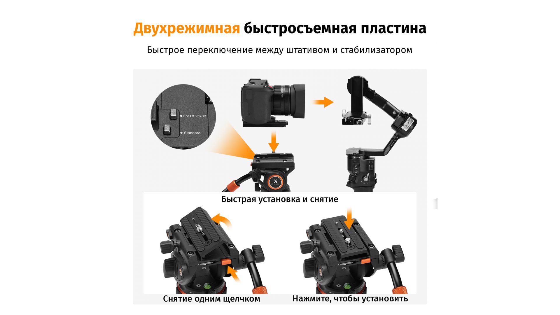 - База быстросъемной пластины с максимальной грузоподъемностью 8 кг совместима с быстросъемными пластинами DJI RS2/RS3 и Manfrotto, что позволяет пользователям быстро переключаться между различными устройствами. Быстросъемная пластина имеет сильную совместимость с винтами 1/4″ и 3/8″