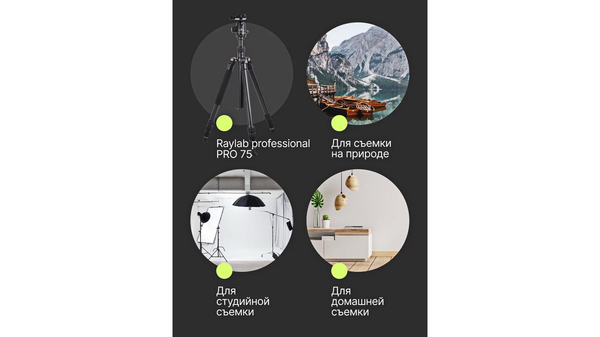 RayLab Pro 75 — удобный и надежный профессиональный штатив, с ним можно творить и реализовывать любые идеи. Максимальная нагрузка 8 кг, что позволяет удерживать камеры с большими объективами. Крюк из крепкого металла позволяет тяжелым грузом надежно закрепить конструкцию — ветер не будет шатать камеру. В комплект штатива входит шаровая голова, она позволяет регулировать наклон камеры и плавно поворачиваться по оси панорамирования. Сама головка съемная, а фото или видео аппараты крепятся с помощью универсальной площадки Arca Swiss. У штатива Про 75 есть специальная функция — можно снять ногу и использовать ее как монопод, что позволяет проводить быструю съемку легким оборудованием. Также производитель позаботился о съемках в условиях низких температур — на одной из ног присутствует антискользящая термонакладка.