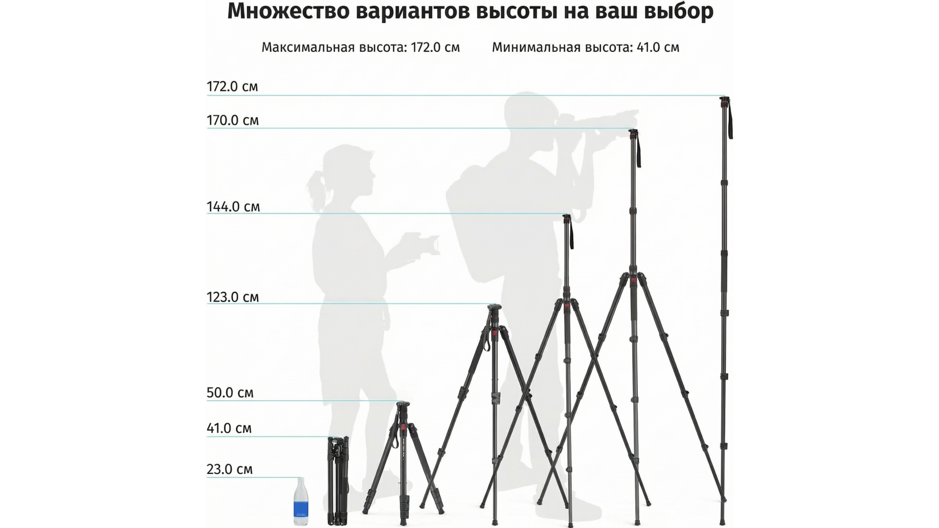 Максимальная высота 170 см позволяет снимать как с уровня глаз, так и сверху, не ограничивая творческие задачи
