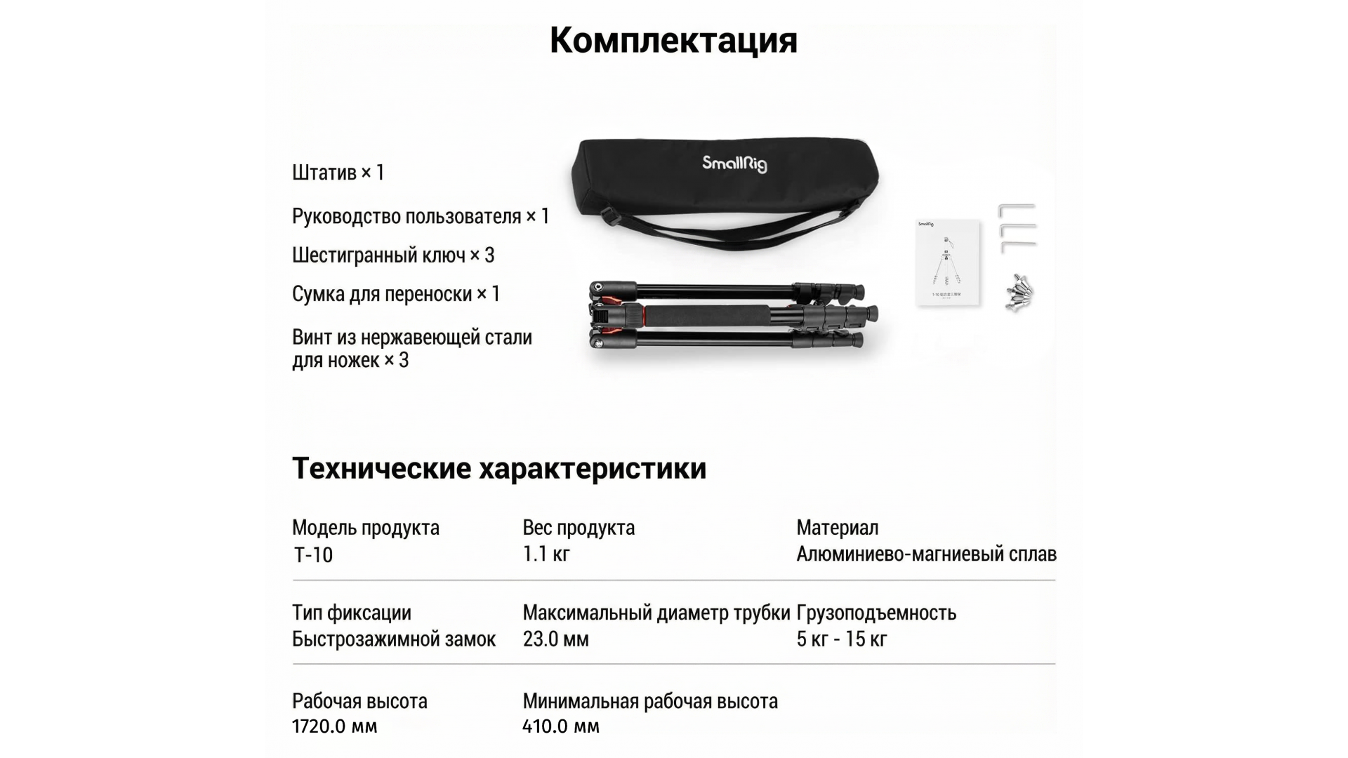 Комплектация:Штатив SmallRig 3983 T-10, чехол, ключи для фиксации и регулировок, шипы для устойчивости ножек