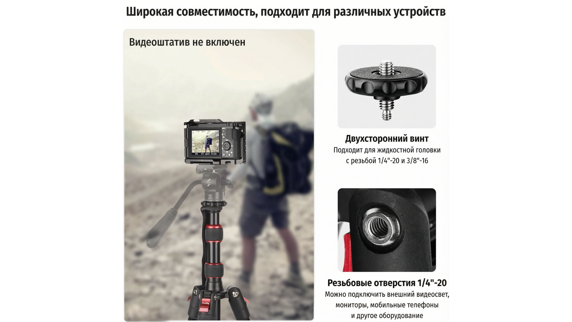 Имеет стандартные резьбы 1/4"-20 и 3/8"-16 — легко совместим с большинством голов, камер, аксессуаров