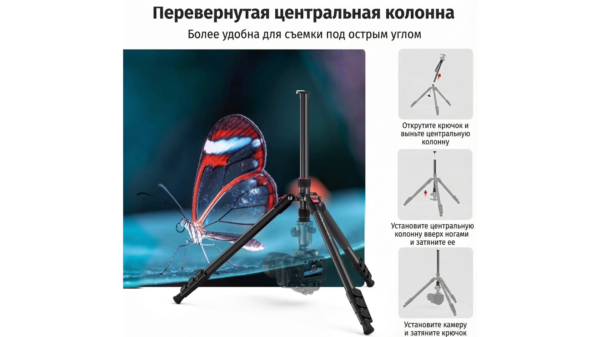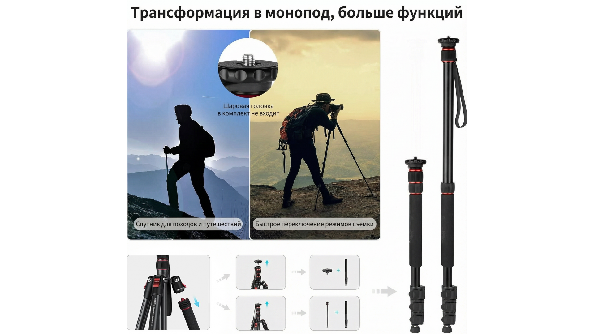 Преобразуется в монопод — универсальное решение для съёмки на ходу, в путешествиях и репортажах