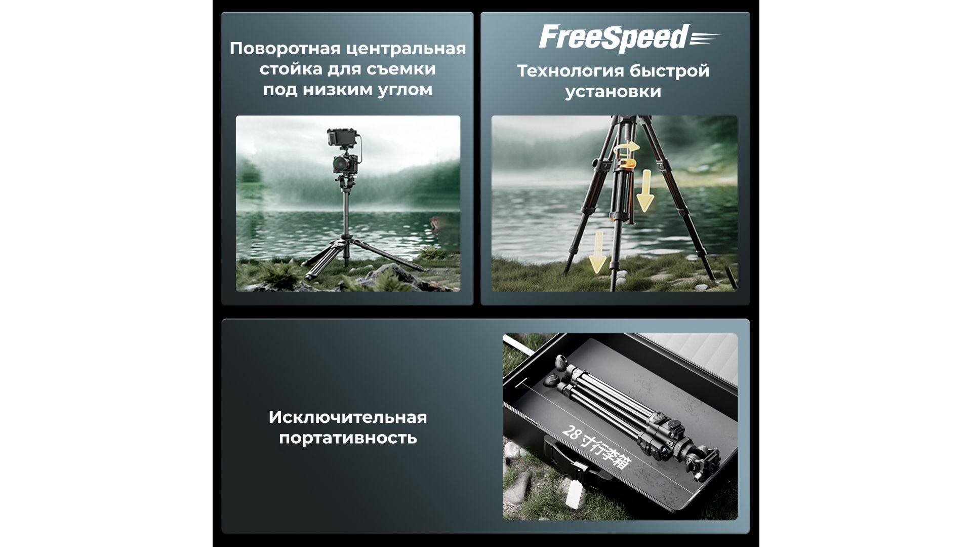 - Предназначен для профессиональной видеосъемки на открытом воздухе. Оснащен технологией FreeSpeed, которая позволяет использовать одноступенчатую систему блокировки - нажатие одного тумблера позволяет быстро заблокировать две секции ног