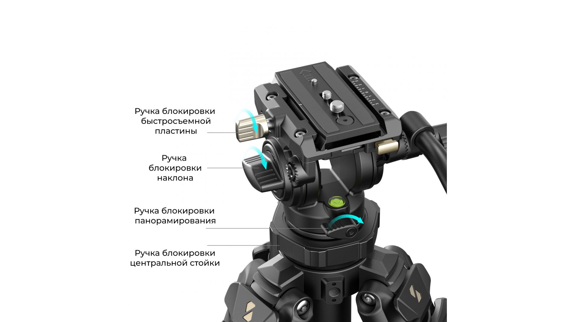 - Центральная колонна имеет встроенную чашеобразную базу, которая позволяет быстро выровнять положение, а съемный шестигранный ключ, встроенный в видеоголовку, обеспечивает удобство монтажа/демонтажа оборудования для камеры и возможность съемки под низким углом на минимальной высоте 31 см