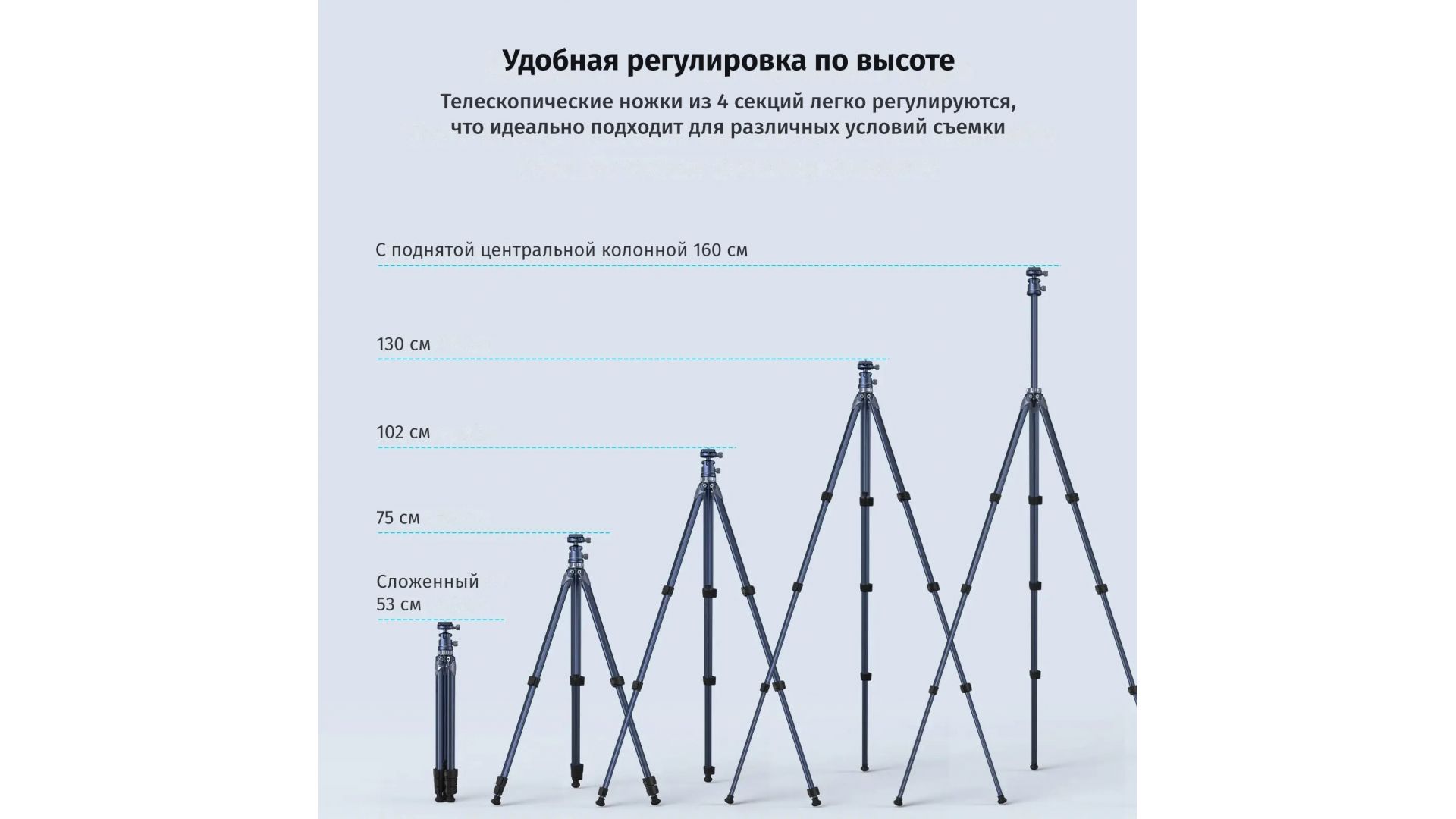 Штатив изготовлен из прочного алюминиевого сплава, нержавеющей стали и АБС-пластика, обеспечивая долговечность и надежность использования.