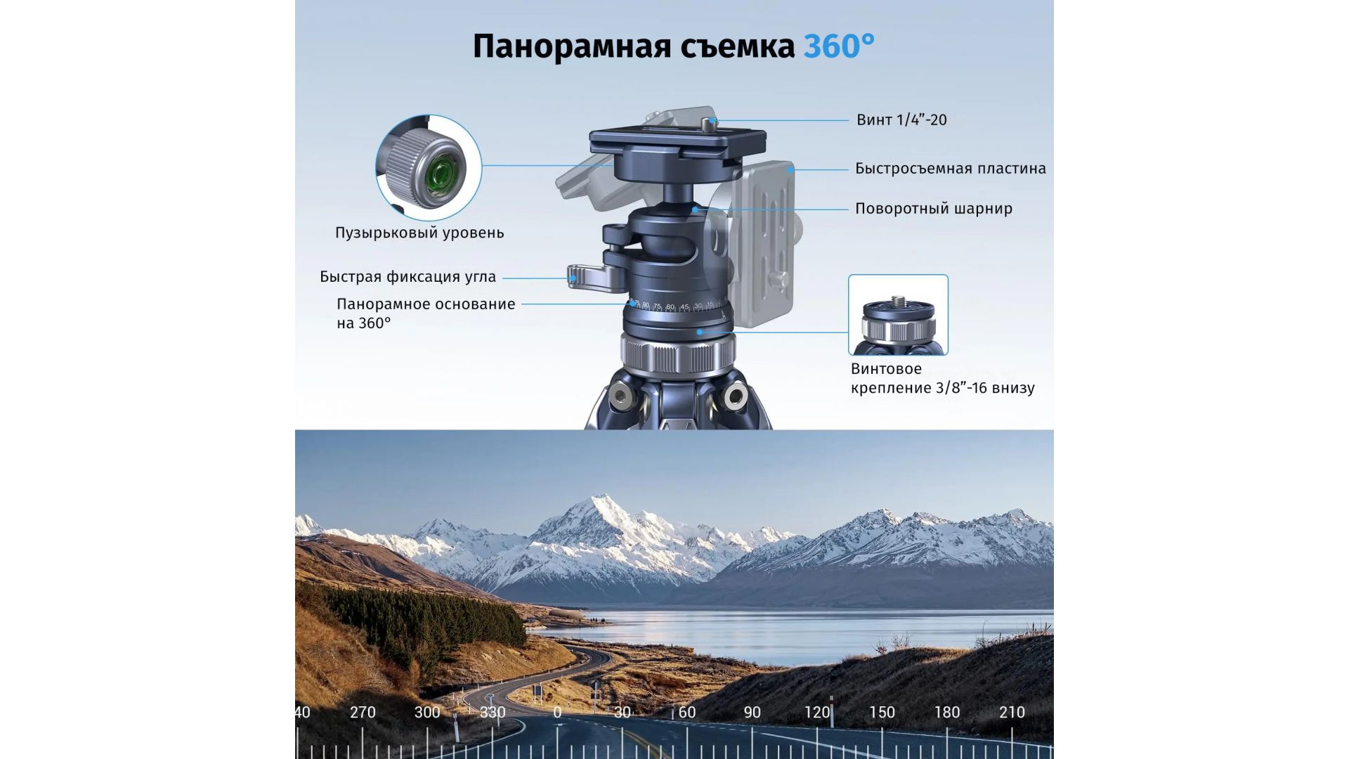 Особенная конструкция головы спроектирована для наибольшей эффективности. Она выдерживает до 8 кг нагрузки, а также имеет быструю блокировку на панорамировании. Быстросъёмная площадка Arca Swiss совместима с аналогичными штативными головами и стабилизаторами. Наличие встроенных 1/4"-20 резьбовых отверстий позволяет легко крепить различные аксессуары, такие как магическая рука, крепления и прочее, обеспечивая гибкость настроек под любые задачи.