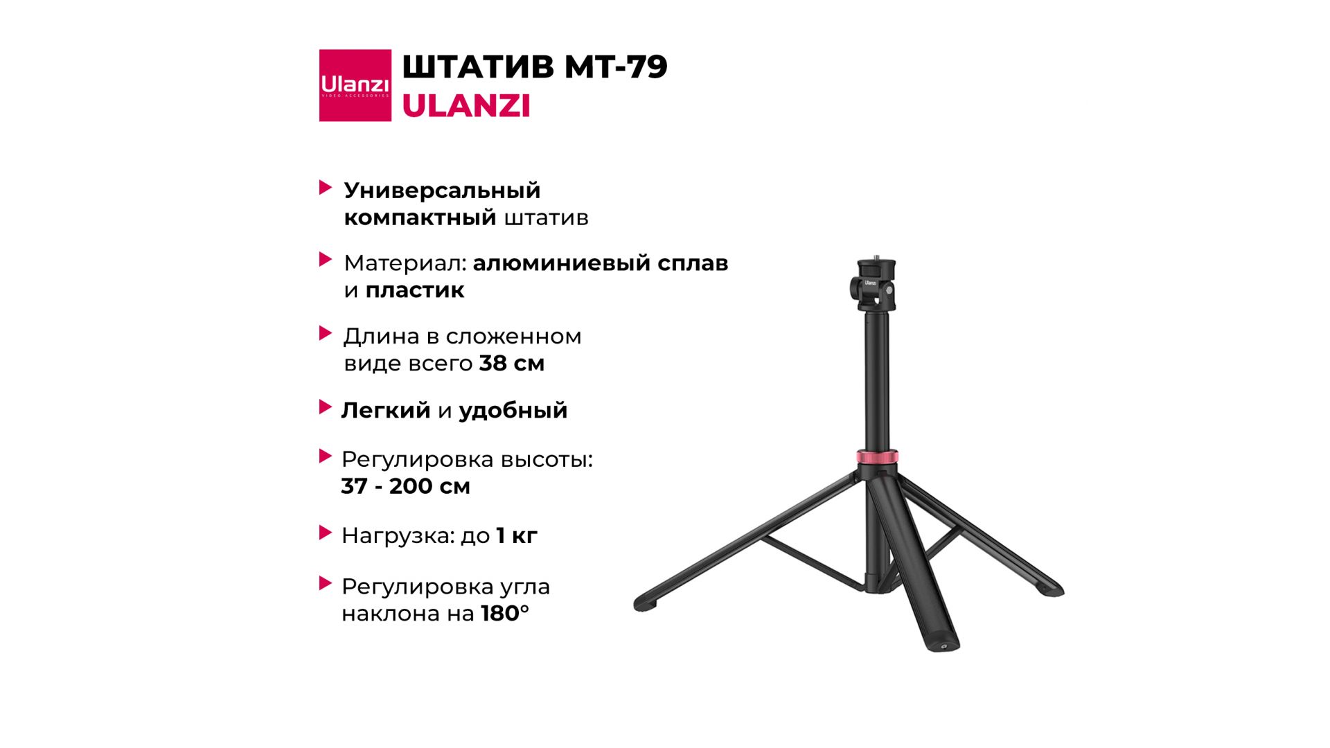 Максимальная высота — 200 см, минимальная — 37 см: удобно для любых сценариев съёмки. Выдерживает нагрузку до 1 кг — подходит для смартфонов, камер, экшн-камер и микрофонов.