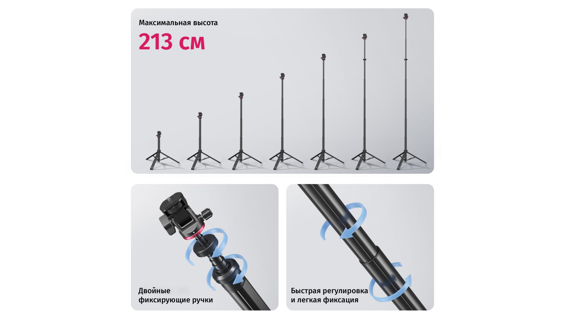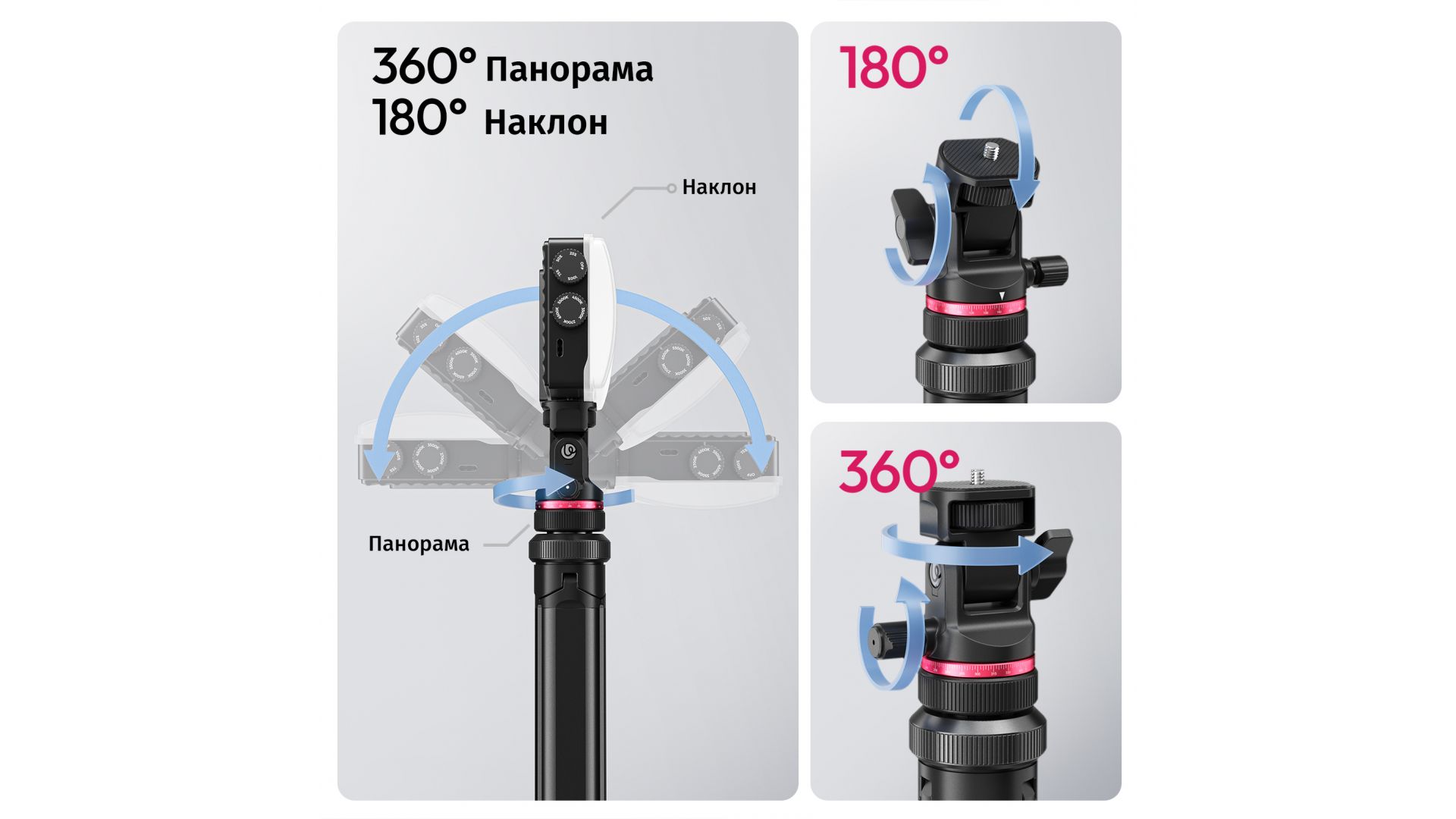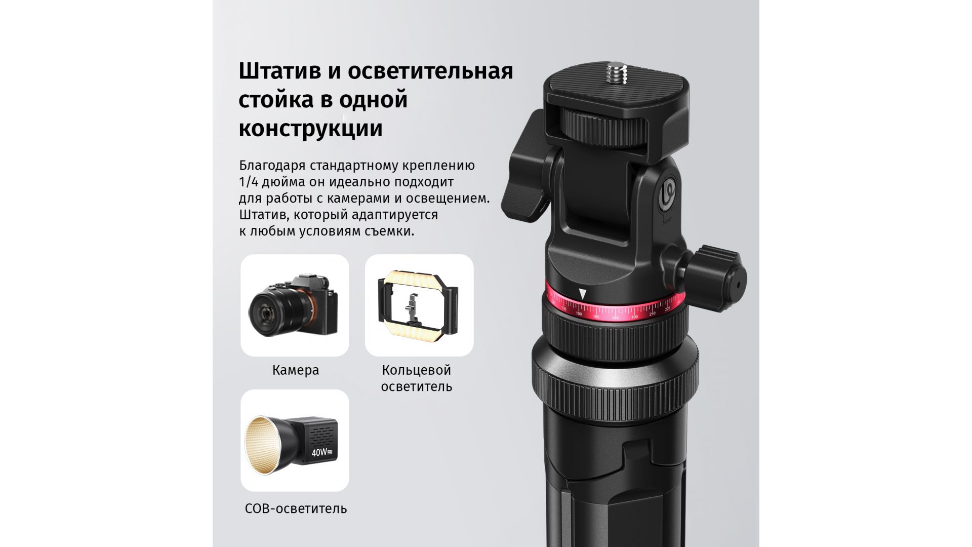 Универсальность гарантирует стандартная резьба 1/4 дюйма для подключения не только камер, но и светодиодных панелей, софтбоксов, смартфонов и другого оборудования. Регулируемая головка с поворотом на 360° и наклоном 180° позволяет точно позиционировать кадр или источник света. Идеальное решение для фотосъемки, видеоблогинга и стриминга в любых условиях.
