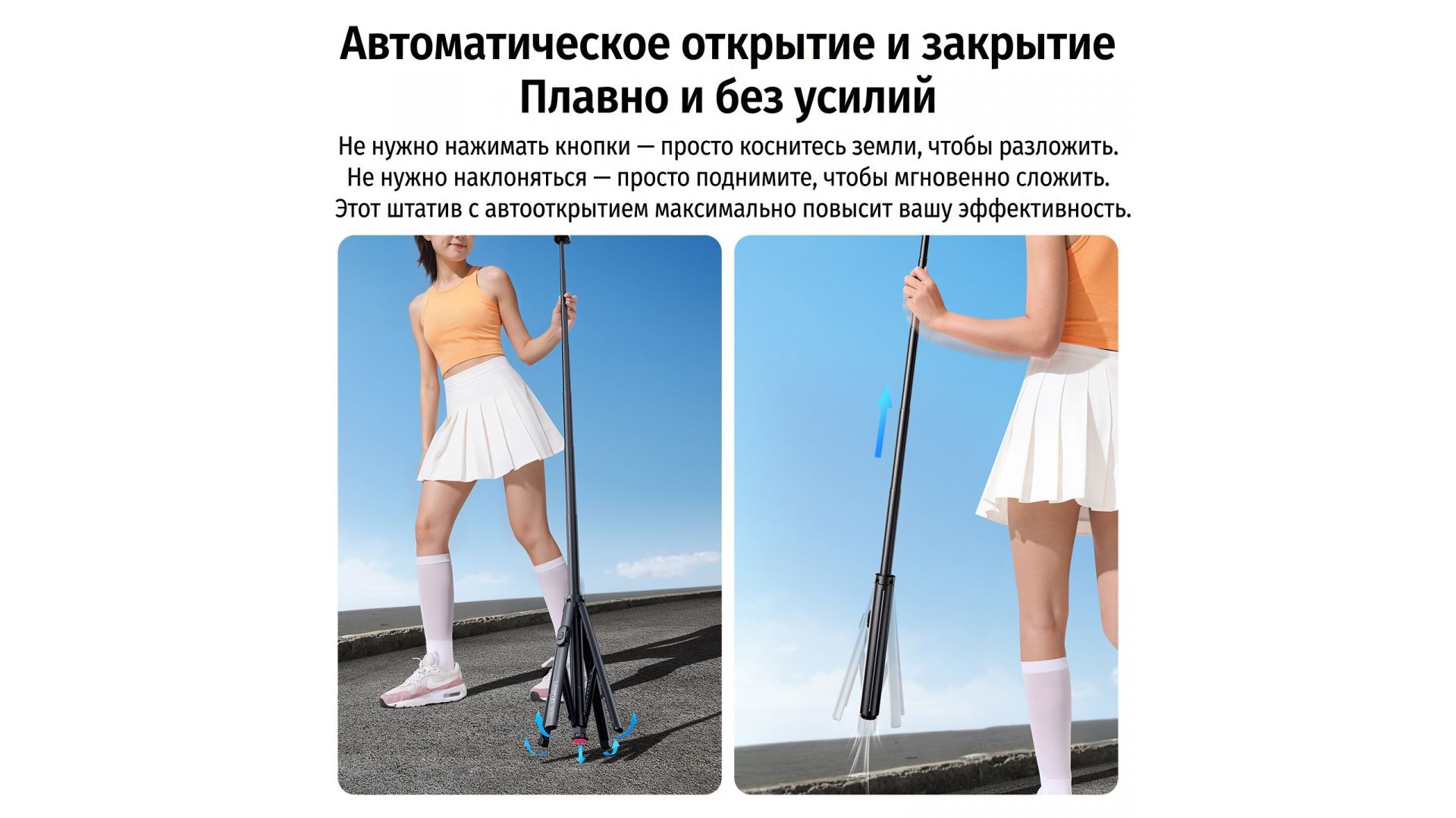 Забудьте о сложных настройках. Инновационный механизм автоматического открывания срабатывает мгновенно при касании земли, а для складывания достаточно просто поднять штатив вверх. Больше никаких защемлений и лишних телодвижений!