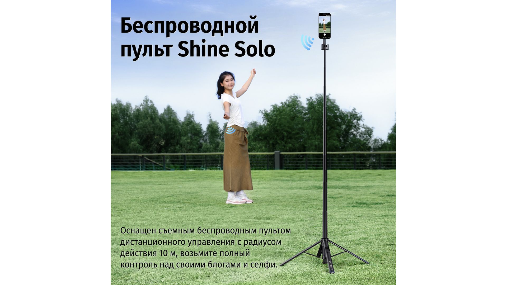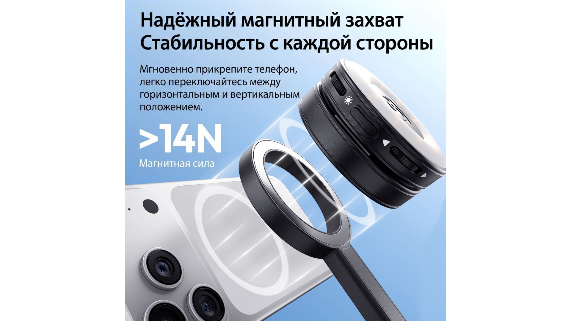Магнитная ручка надежно фиксирует телефон, мгновенно переключаясь между горизонтальным и вертикальным режимами. В комплекте — беспроводной пульт Shine Solo (радиус 10 м) для полного контроля съемки.