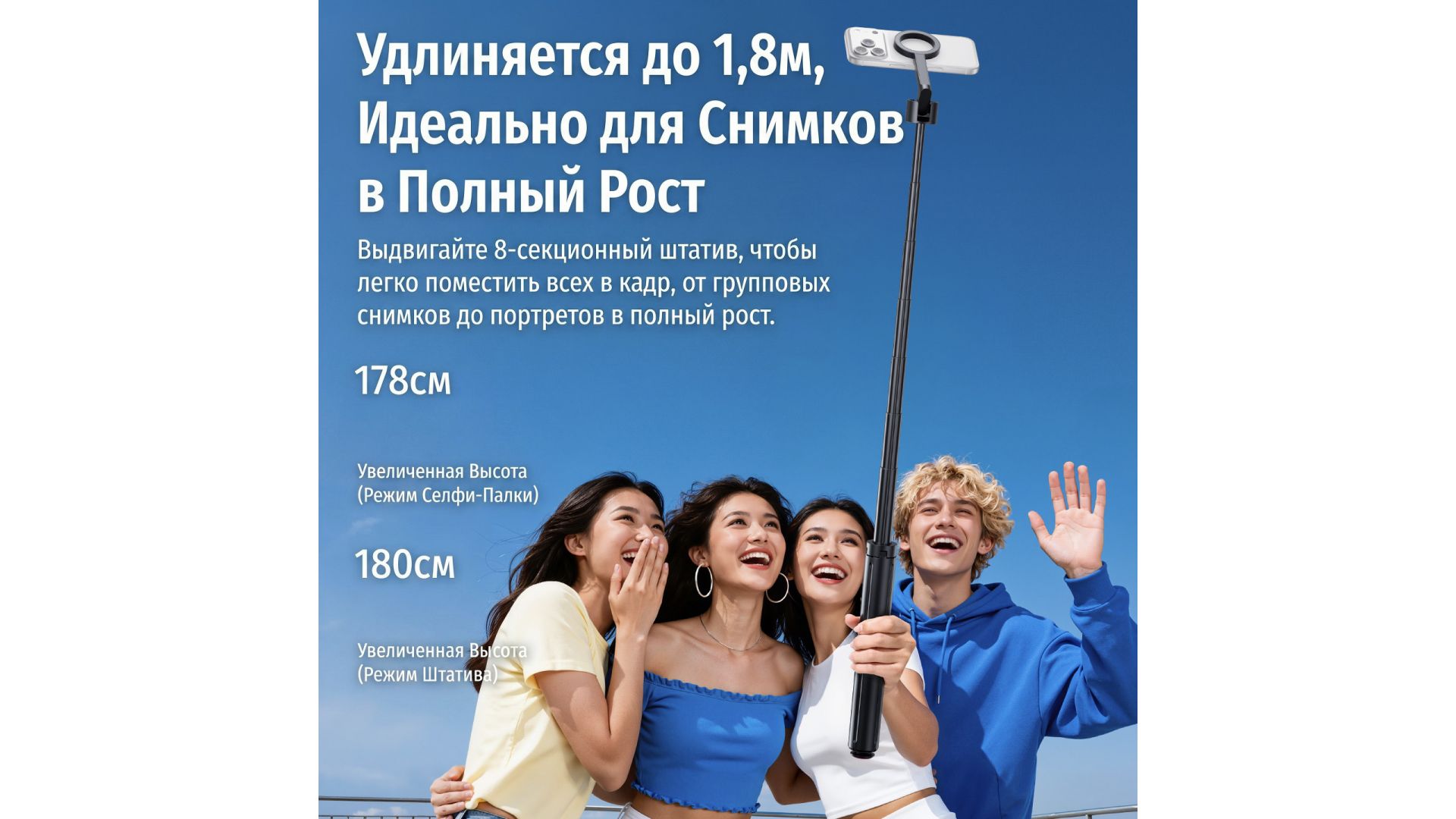 Прочный алюминиевый корпус раскладывается на высоту до 180 см, обеспечивая идеальный ракурс для группового фото или портрета в полный рост. Устойчивая четырехногая конструкция гарантирует надежность на любой поверхности.
