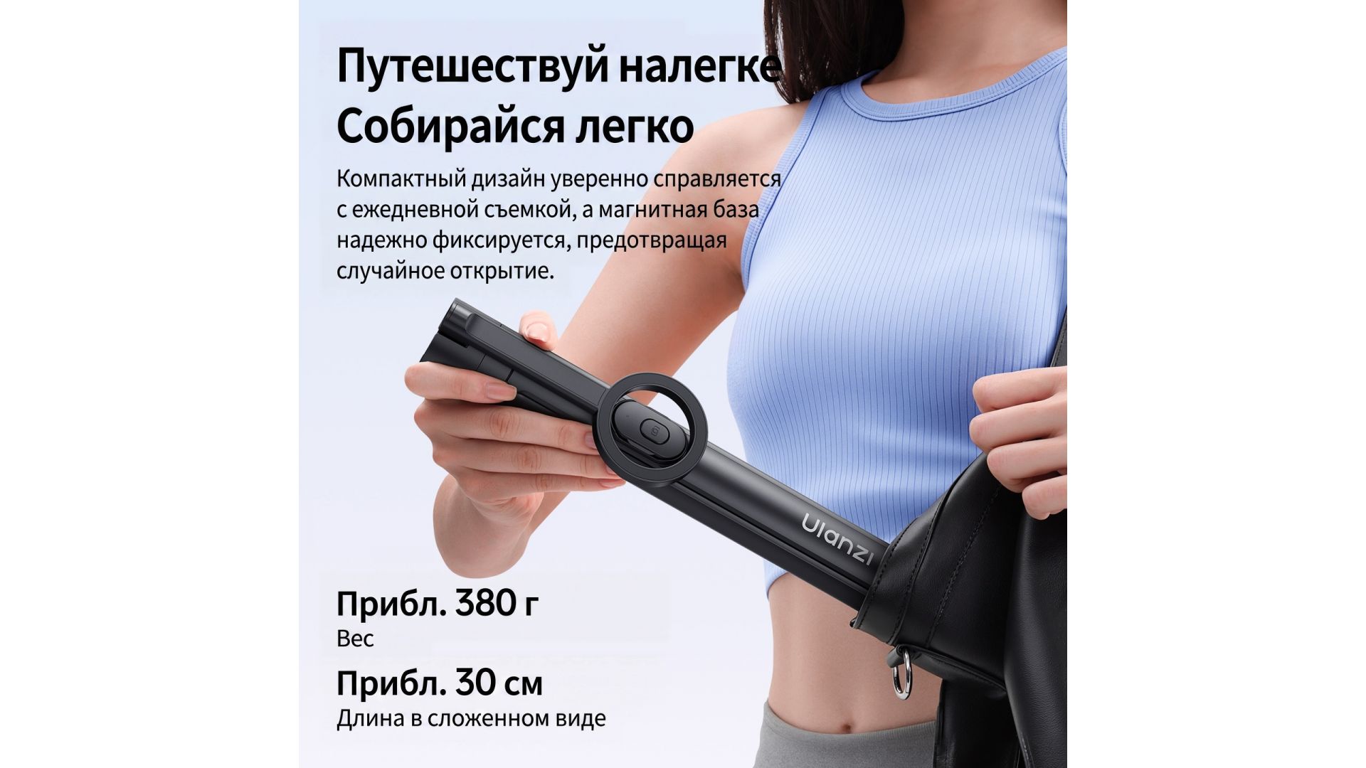 В сложенном виде штатив компактен (29,5 см) и легок (380 г), а магнитное основание предотвращает случайное раскрытие в рюкзаке. Вес — всего 380 г. Ваш идеальный помощник для ярких кадров!