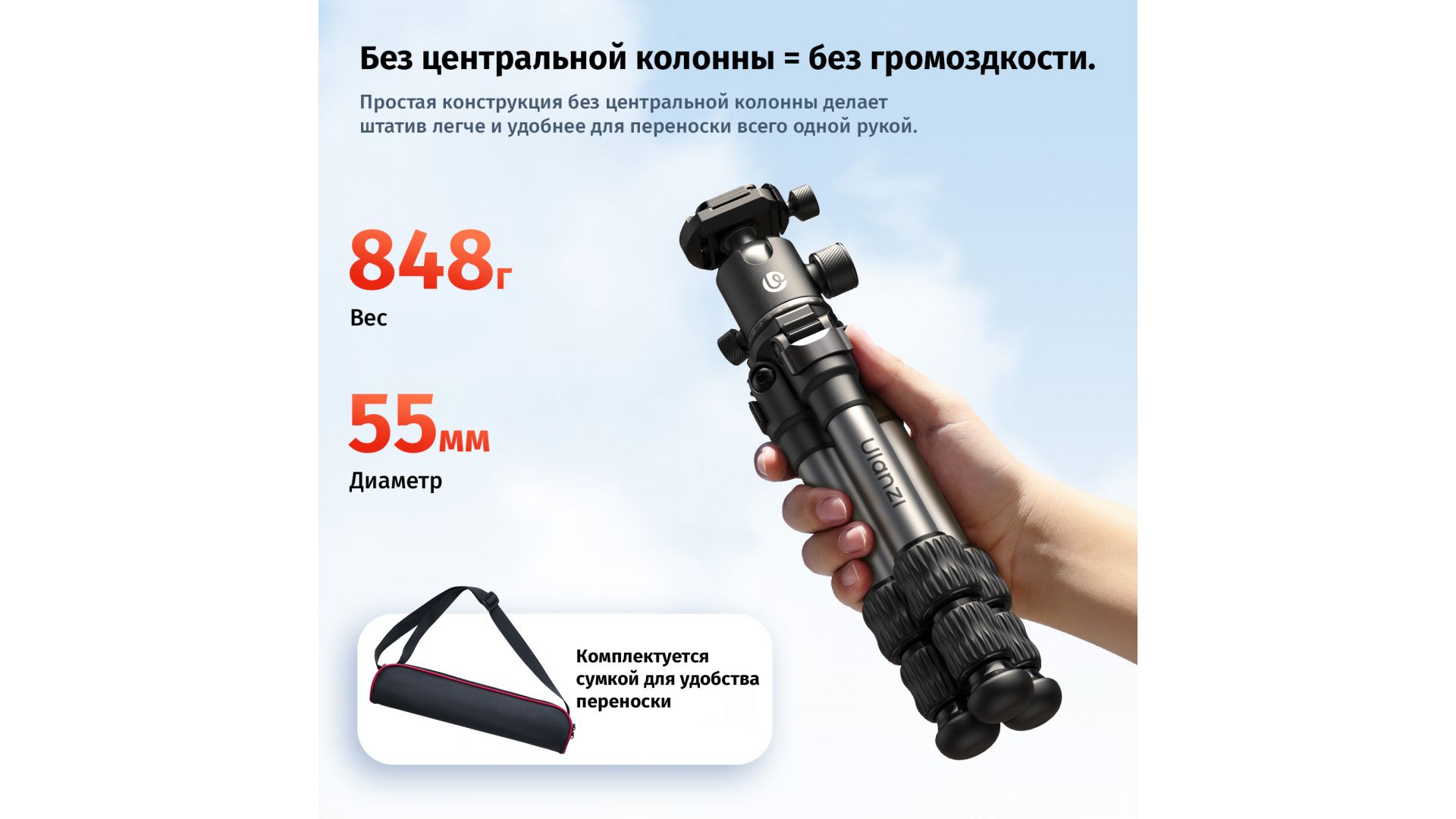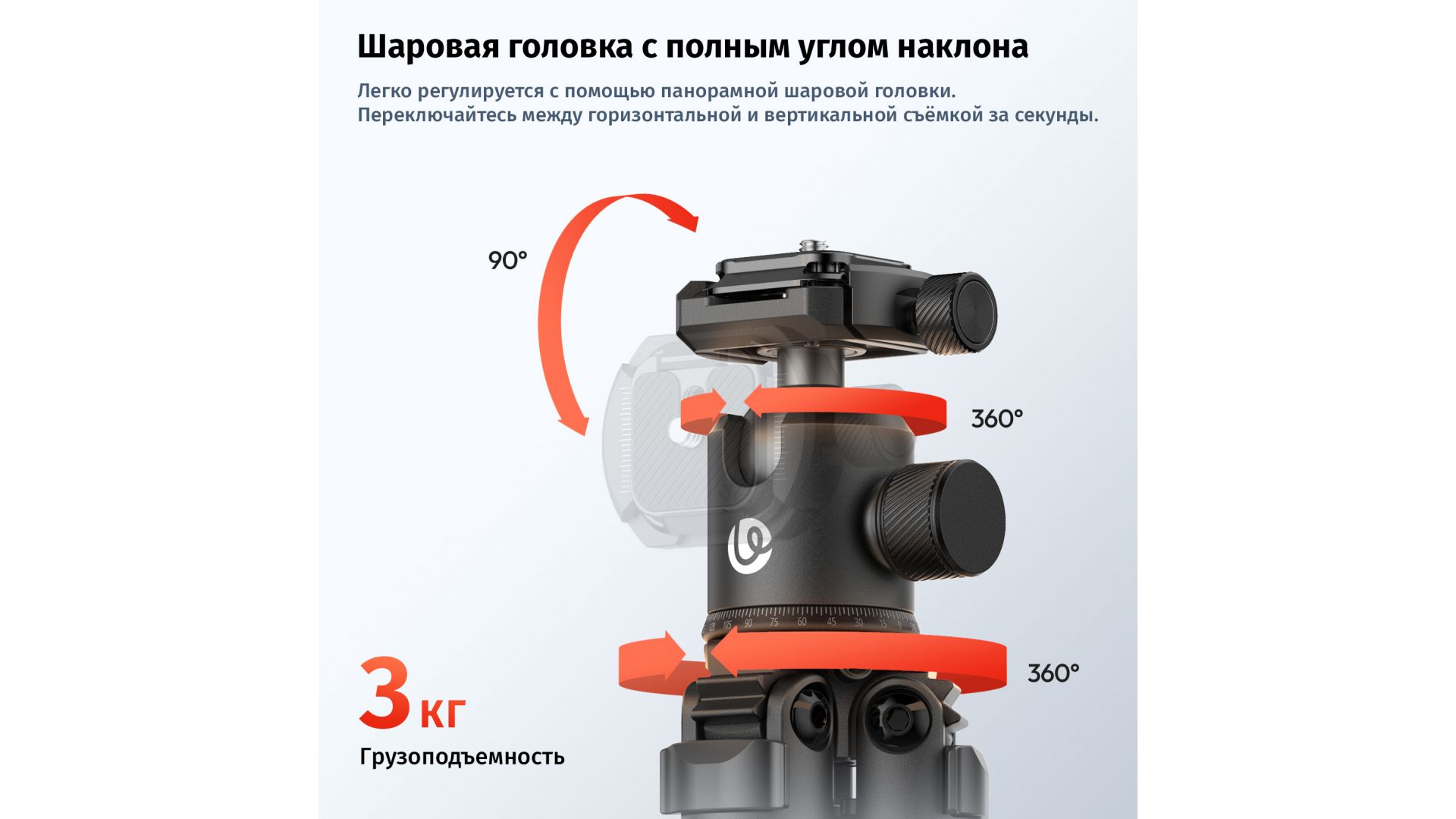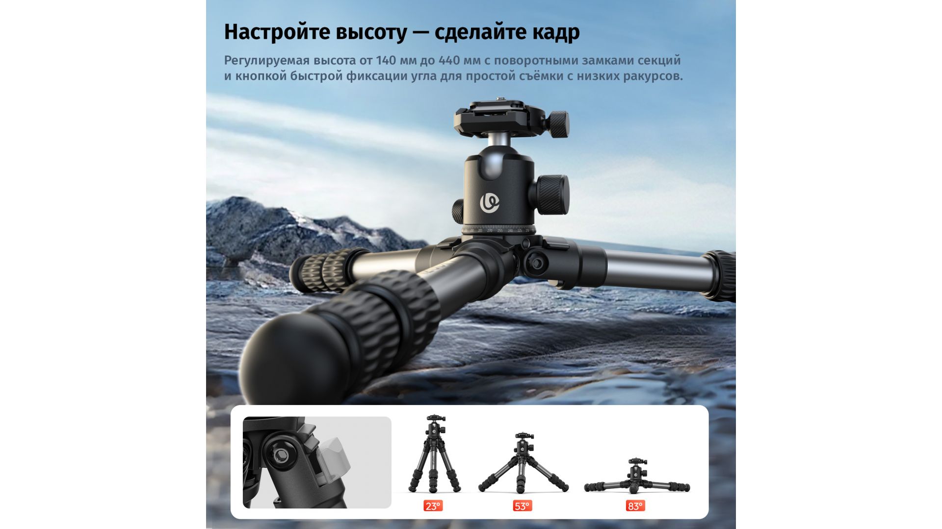Панорамная шаровая головка позволяет легко менять ракурс, быстро переключаясь между горизонтальными и вертикальными снимками. Высота регулируется от 140 до 440 мм, а кнопка быстрого поворота помогает снимать под низким углом.