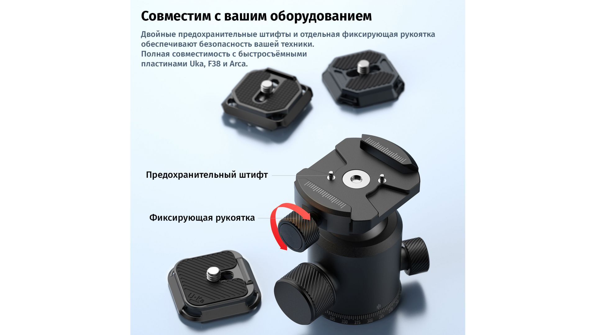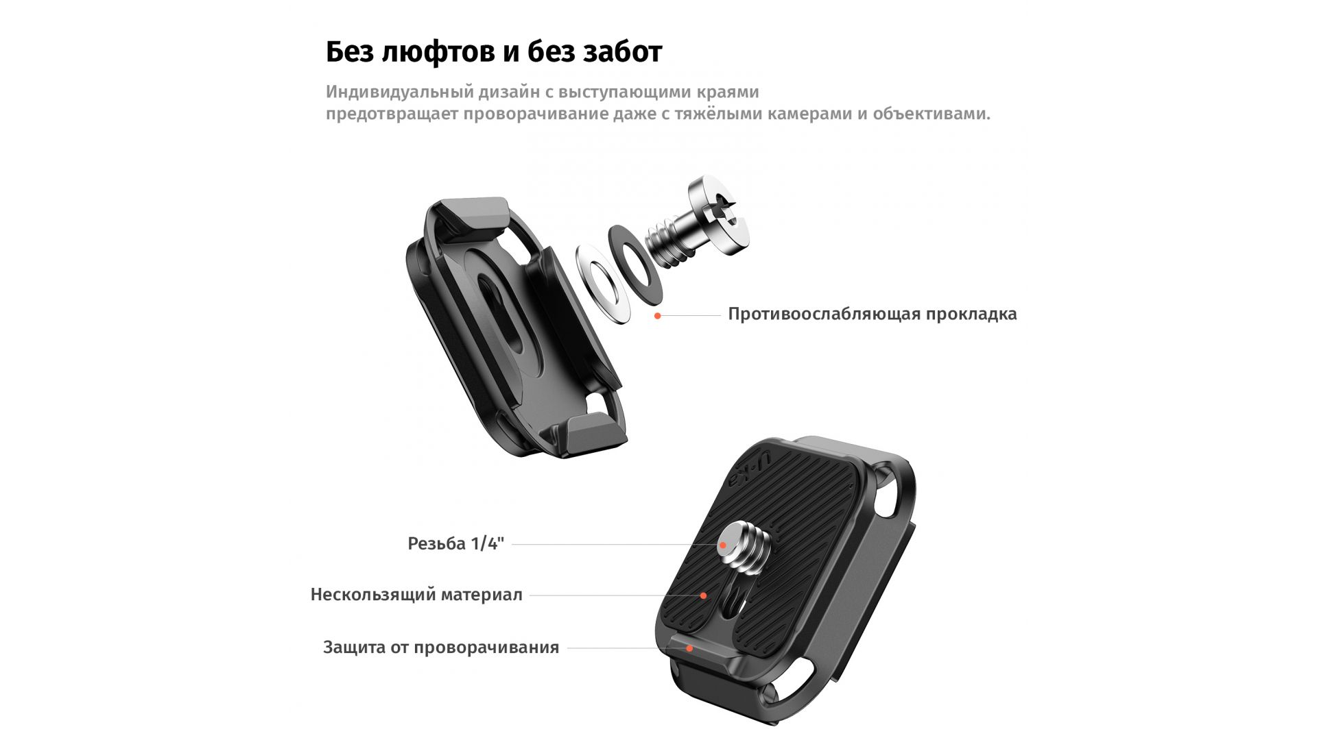 Прочные алюминиевые ножки и металлический корпус выдерживают до 20 кг, а съемные противоскользящие накладки гарантируют устойчивость. Боковое отверстие 1/4" позволяет крепить аксессуары: ручки, держатели или свет. Приподнятые края предотвращают скручивание даже с тяжелыми камерами.