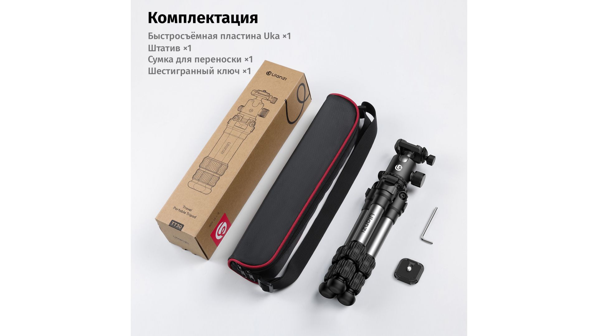Комплектация:Штатив Ulanzi TT30, сумка, быстросъемная пластина Uka, шестигранный ключ