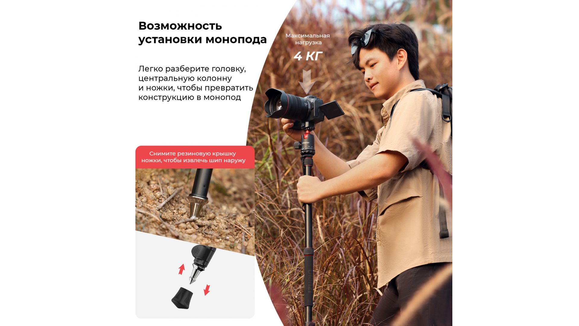- Легко разберите головку, центральную колонну и ножки, чтобы превратить конструкцию в монопод;