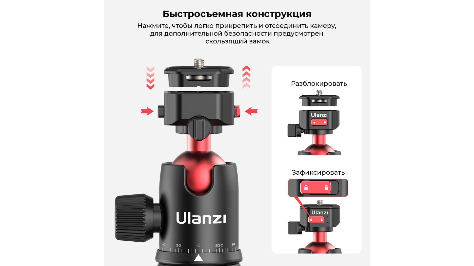 - Быстросъемная конструкция: Нажмите, чтобы быстро прикрепить и отсоединить камеру, для дополнительной безопасности предусмотрен фиксатор;