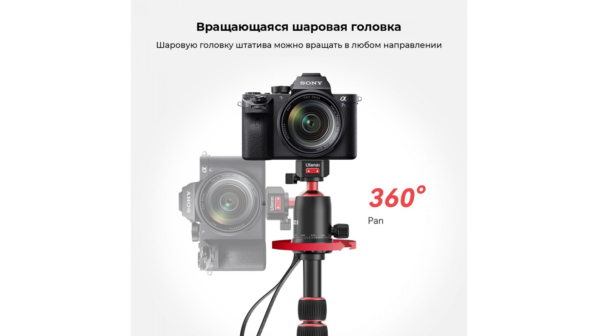 - Вращающаяся на 360° шаровая головка: Шаровая головка штатива может вращаться в любом направлении;