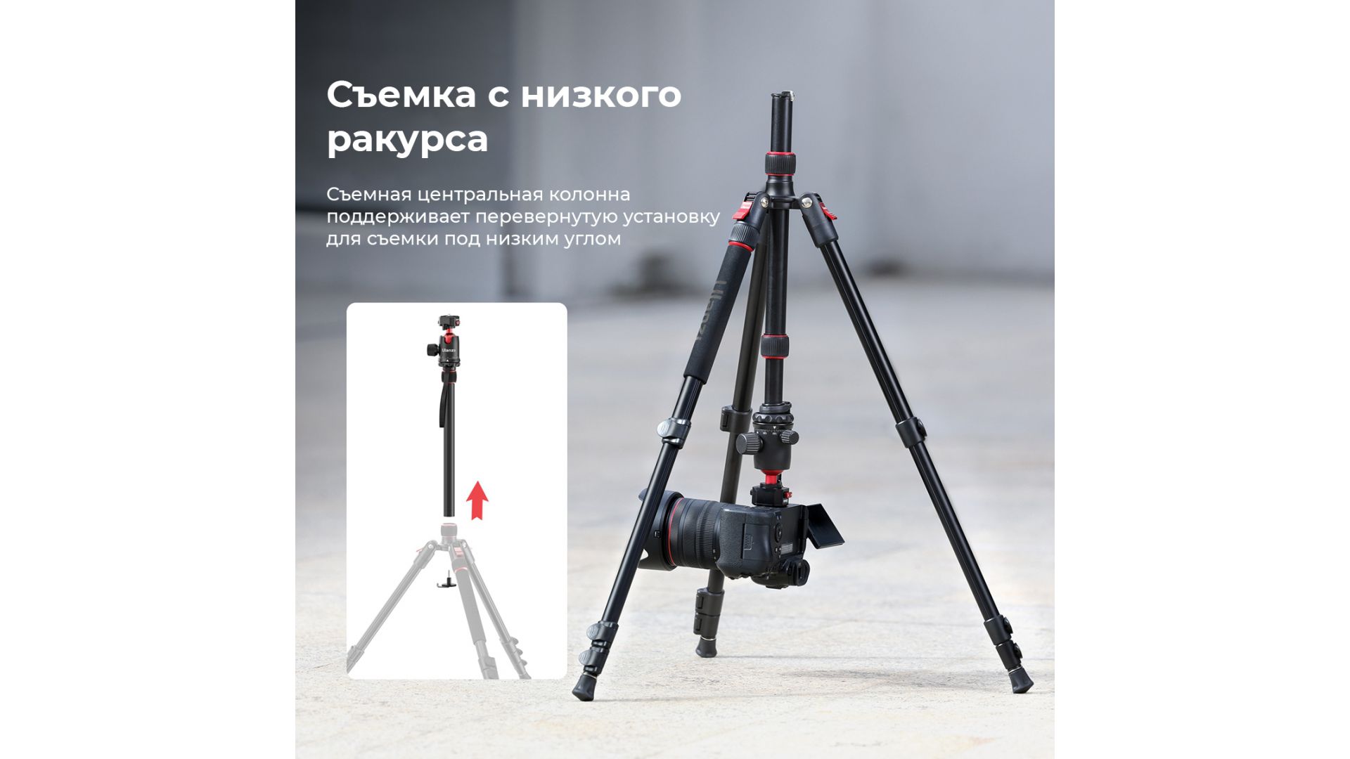 - Съемка с земли: Съемная центральная колонна поддерживает перевернутую установку для съемки под низким углом.