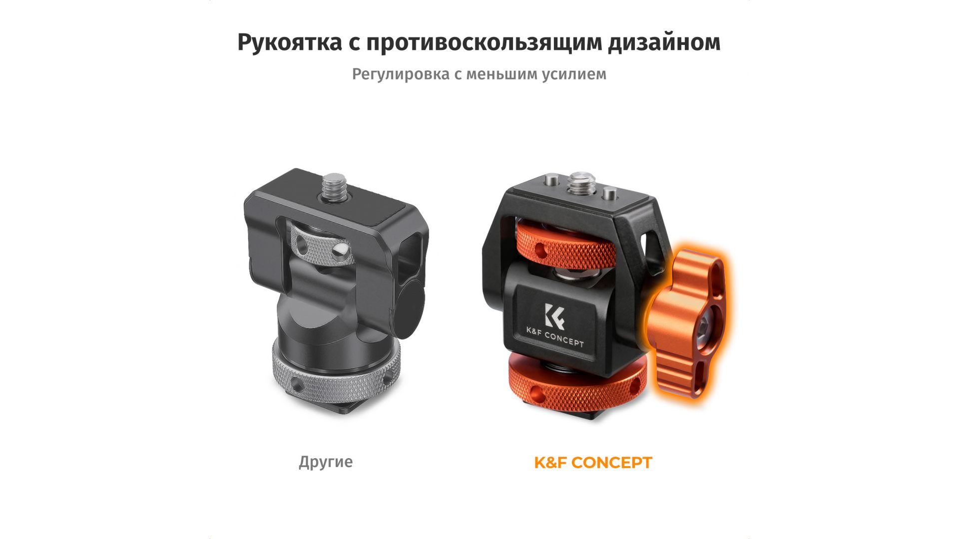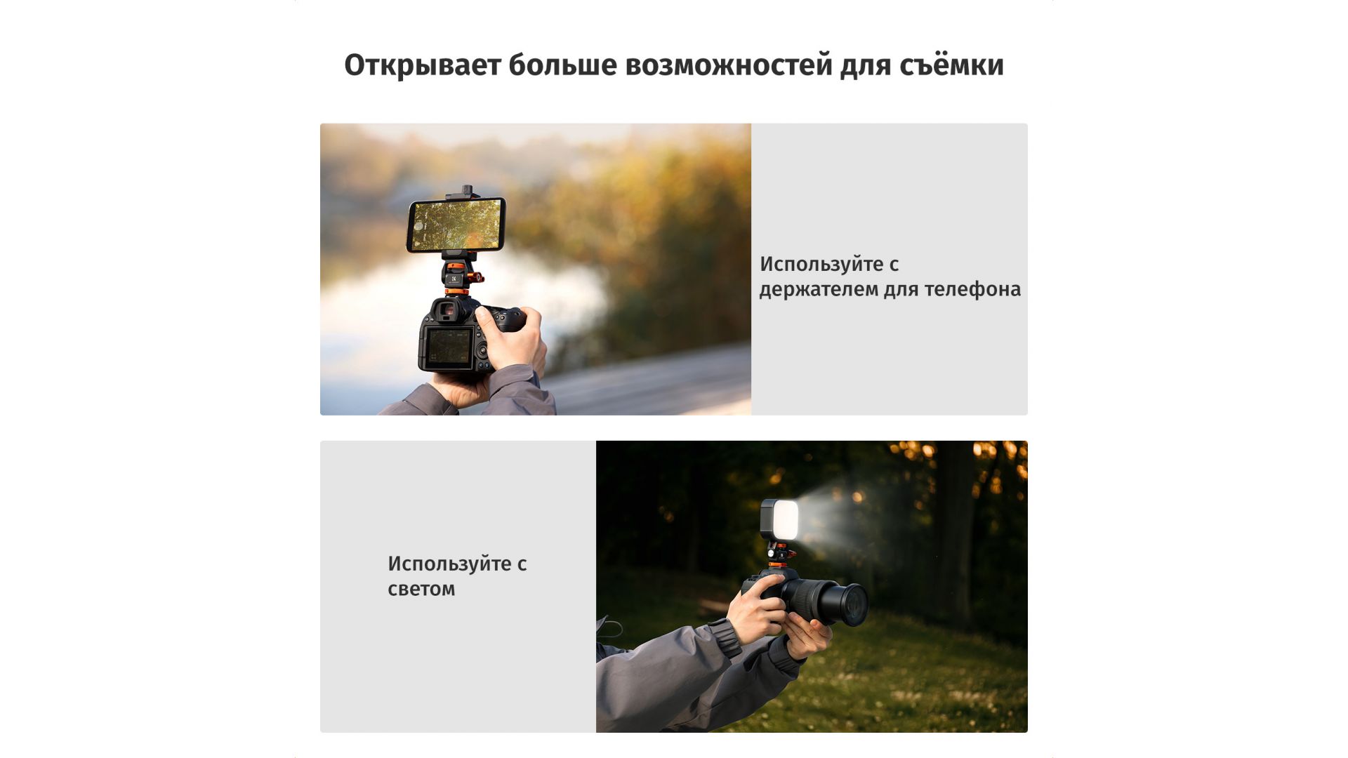 Гибкая регулировка с демпфированием позволяет моментально менять угол наклона шарнира боковой ручкой, а горизонтальную ось — с помощью ключа. Головка обеспечивает невероятную свободу: наклон до 180° и панорамный поворот на 360°. Это открывает возможности для любых ракурсов — от синхронной съемки на камеру и смартфон до установки дополнительного света.
