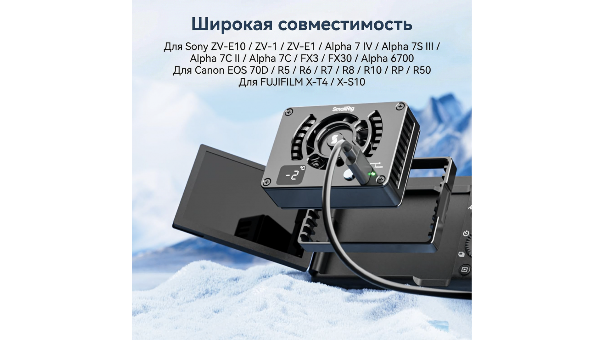 Система охлаждения SmallRig для камер Sony / Canon / FUJIFILM 4815 предназначена для охлаждения беззеркальных камер и увеличения продолжительности записи видео в высоком разрешении. В системе охлаждения используется высокоэффективный вентилятор с модулем охлаждения TEC для быстрого охлаждения камеры и эффективного решения проблемы перегрева.