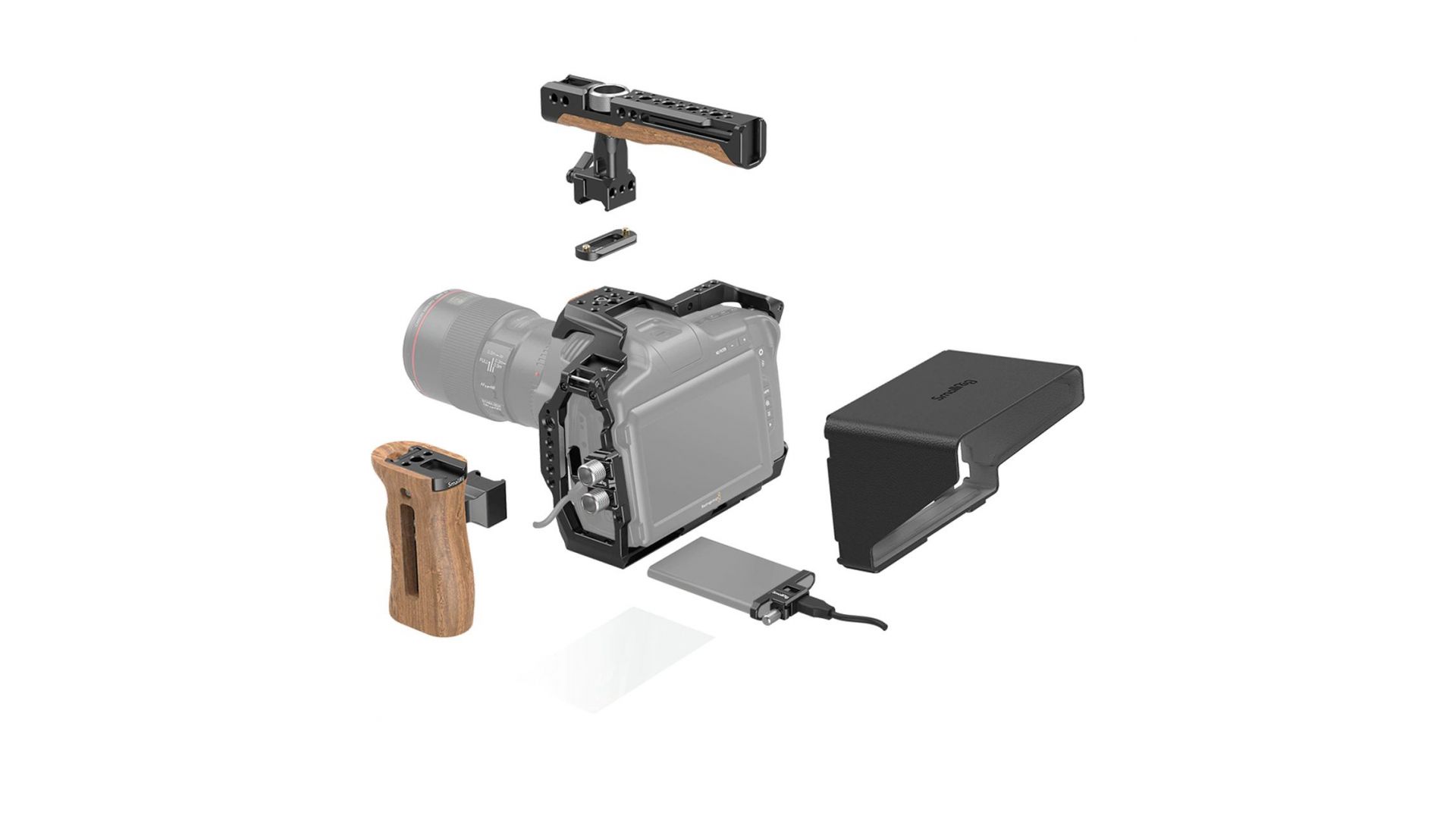 Комплектация:Коробка, рукоятка NATO 2362, крепление Mini NATO Rail 2172, зажим T5 SSD Clamp & USB-C Cable Clamp 3300, деревянная боковая рукоятка NATO 2187, солнцезащитный козырёк BMPCC 6K Pro Sunhood 3273, защитное стекло BMPCC 6K Pro Screen Protector 3274, зажим для кабеля BMPCC 6K Pro HDMI&USB-C Cable Clamp 3271, шестигранный ключ, винты 1/4” (3 шт.).