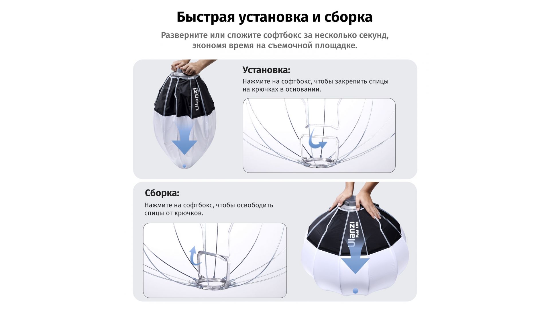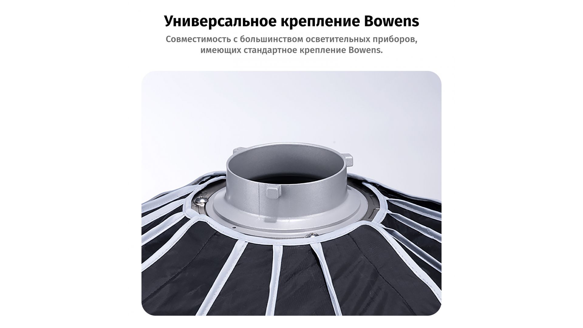 Софтбокс L80 серии Fold – идеальное решение для мягкого и равномерного освещения на съемках. Модель Lantern выполнена в форме сферы и оснащена байонетом Bowens, что обеспечивает совместимость с большинством студийных осветителей.