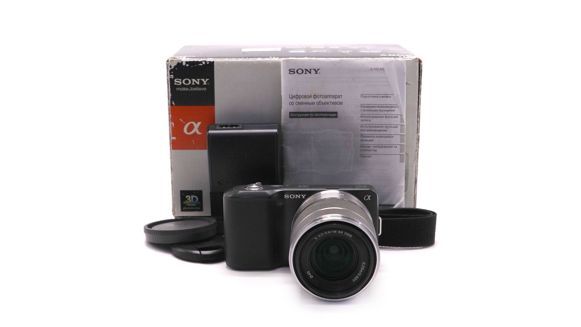 Комплектация:Коробка, зарядное устройство, аккумулятор, объектив Sony 18-55mm f/3.5-5.6 OSS, ремень, крышка объектива, крышка байонета, фотовспышка Sony HVL-F7S, документы