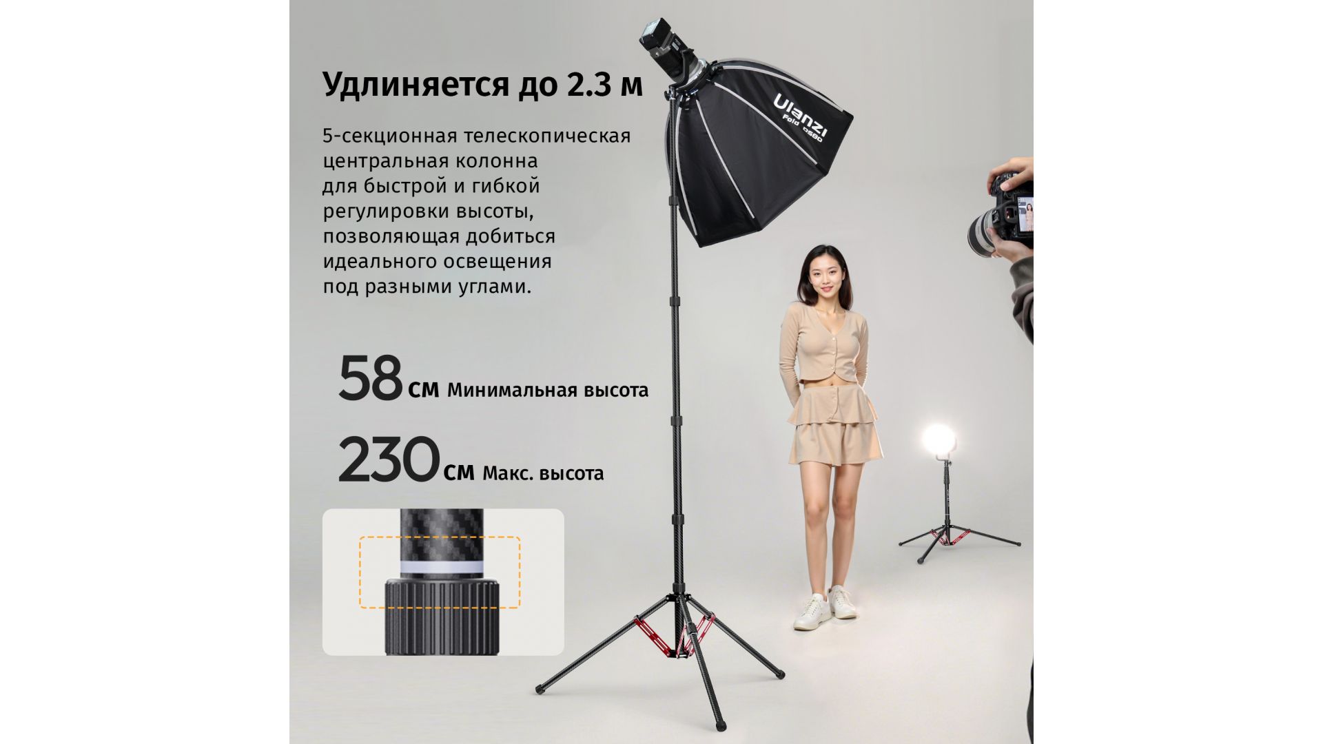 Телескопическая конструкция из 5 секций позволяет быстро регулировать высоту от 58 см до 2,3 метров для идеального расположения света. Стойка легко складывается до 57 см и комплектуется сумкой для переноски, что делает ее идеальной для мобильной работы.