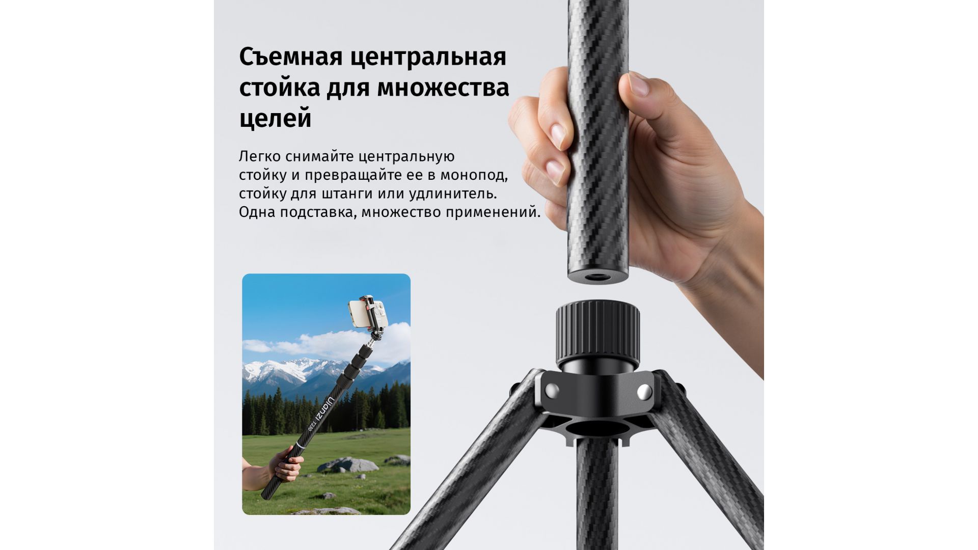 Уникальная особенность — съемная центральная колонна, которая за 3 простых действия превращается в монопод или удлинитель. Независимо регулируемые ножки с индикатором выравнивания обеспечивают устойчивость на любой поверхности.