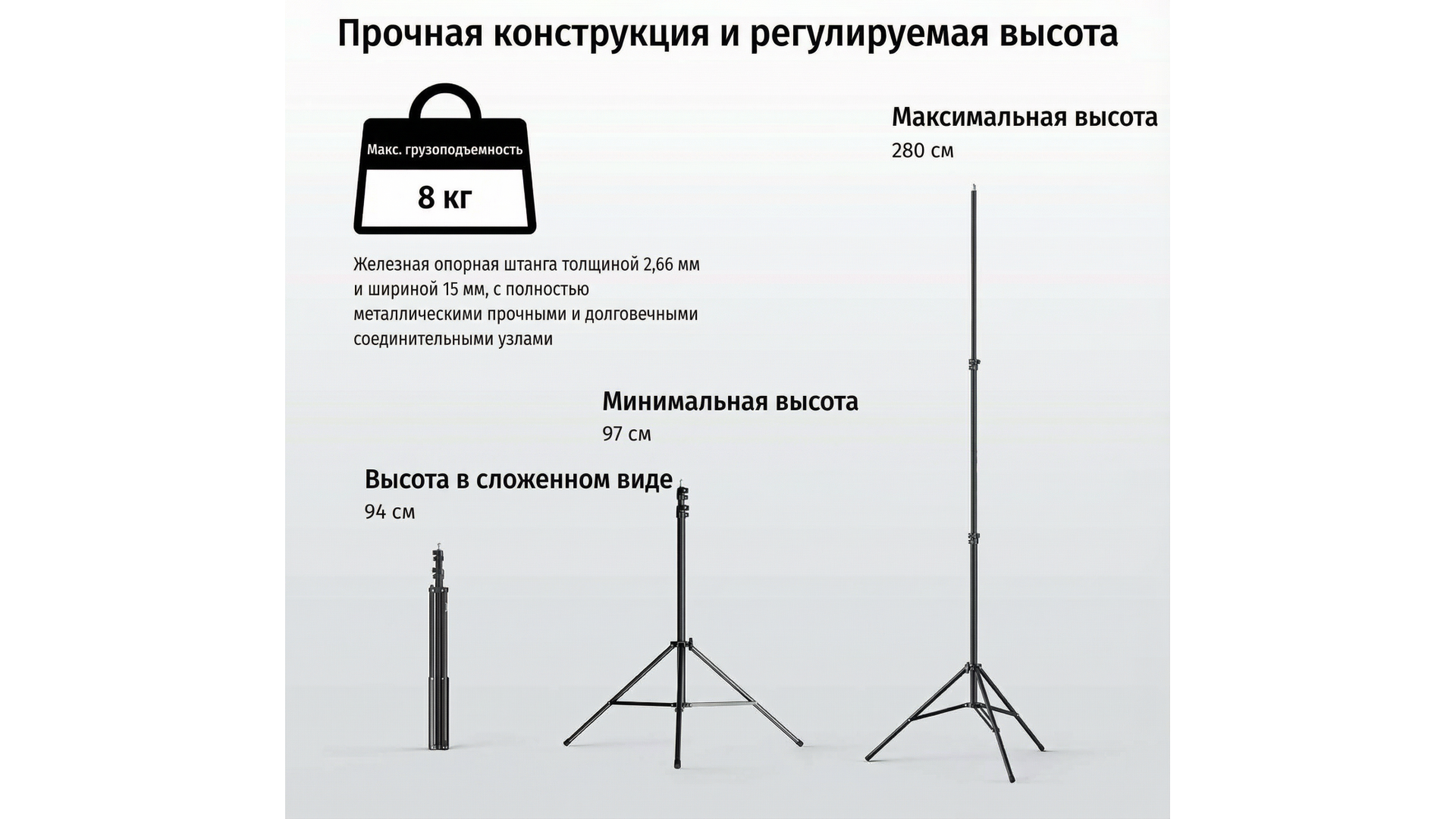 Стойка SmallRig RA-S280 (модель 3736) — универсальное и прочное решение для установки осветительного оборудования в студии и на выездных съёмках. Изготовленная из высокопрочных металлов, она отличается надёжностью и устойчивостью. Диапазон регулировки высоты от 94 до 280 см позволяет точно настраивать положение света под любые задачи. Для безопасности при работе предусмотрена воздушная амортизация, смягчающая опускание оборудования. Быстрые откидные зажимы упрощают настройку, а резьбовой адаптер 1/4"-20 из нержавеющей стали и плоское соединение обеспечивают надёжное крепление различных аксессуаров.