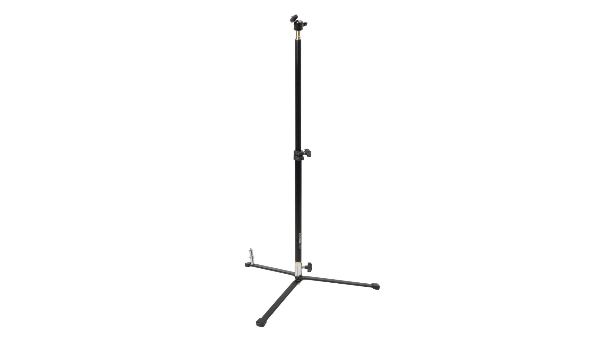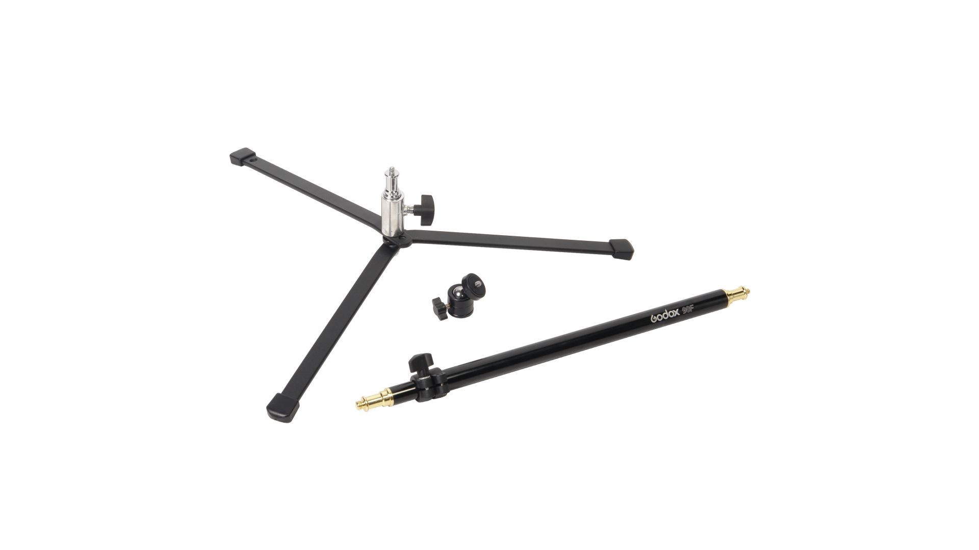 Стойка Godox 90F снабженашаровой миниголовкойс металлическим винтом на конце с посадочной резьбой 1/4”, на который устанавливаются, например, цифровые камеры. Установленное оборудование может вращаться вокруг своей оси на 360 и наклоняться вперед в пределах 90°.