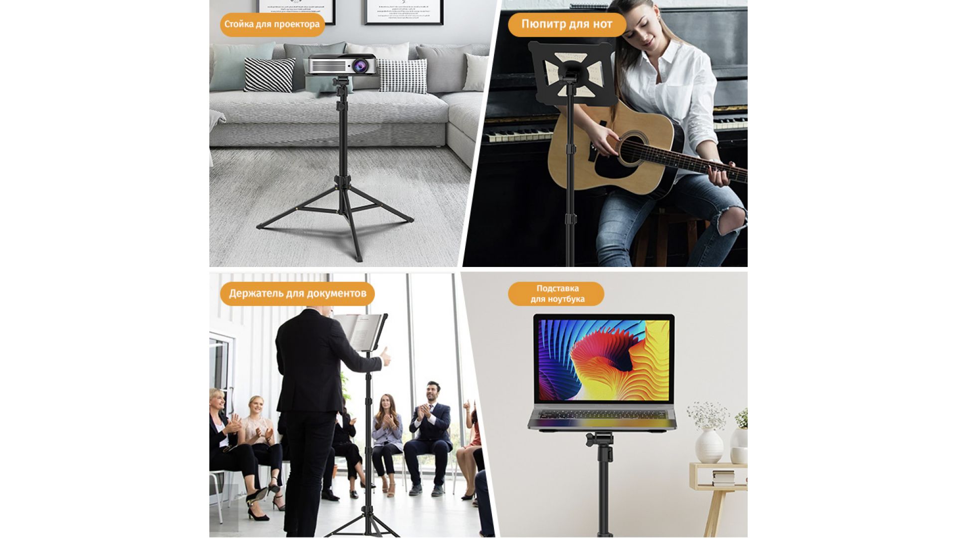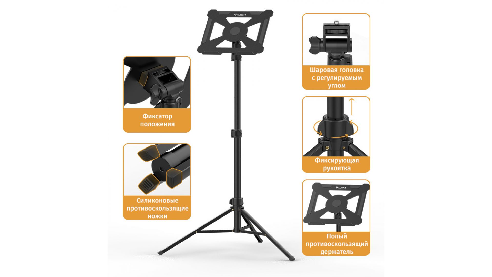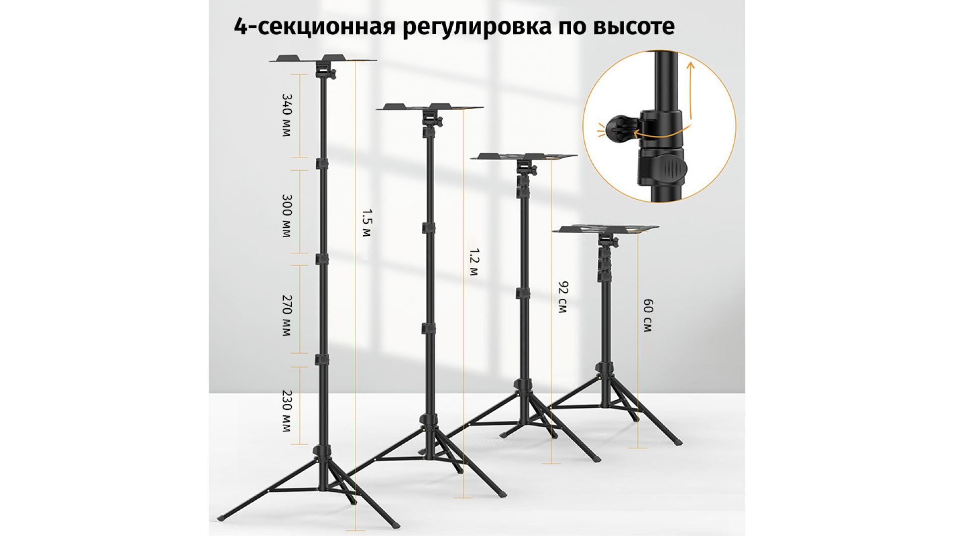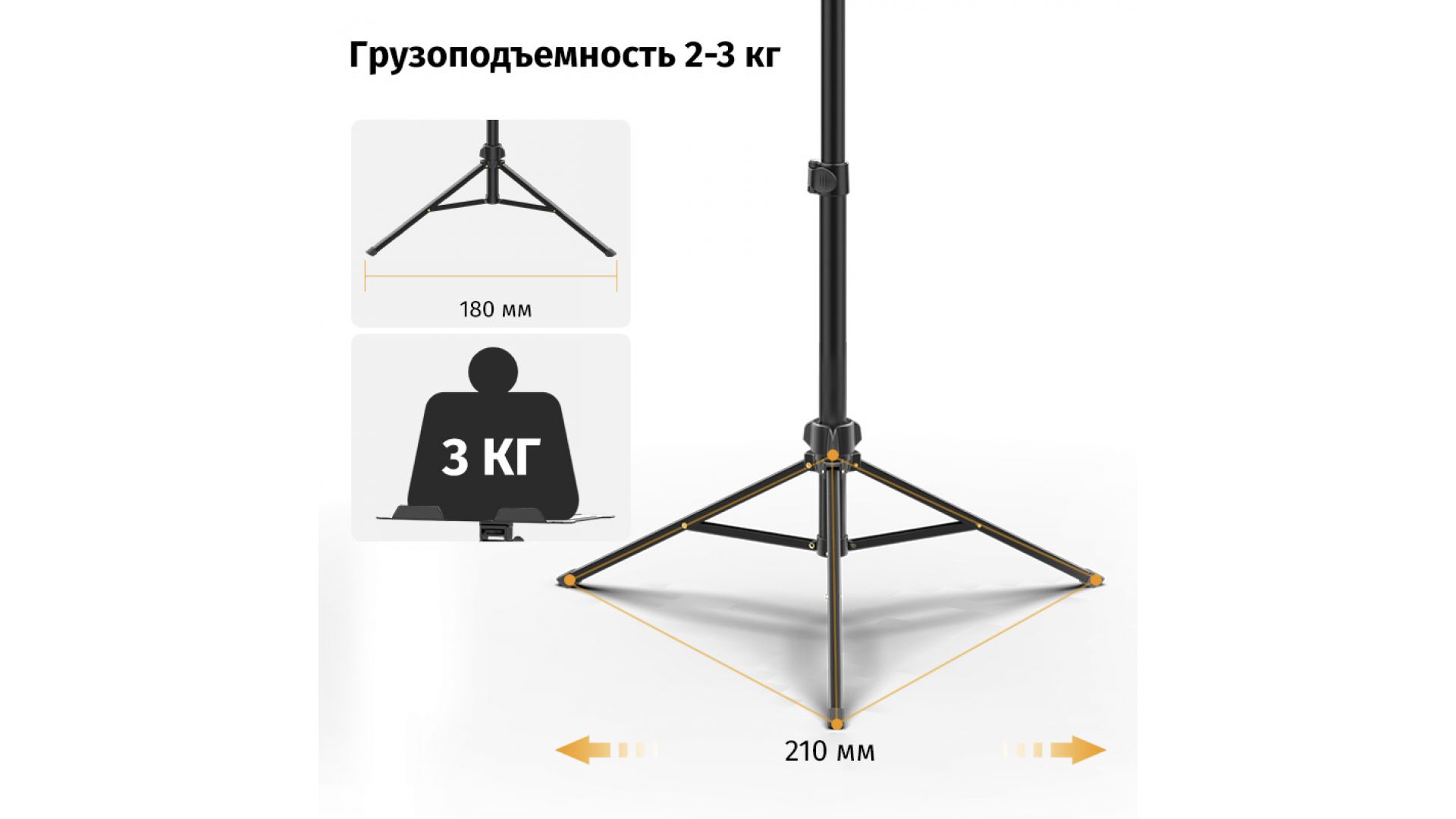 Компактная и легко складываемая конструкция удобна для транспортировки - идеально подходит для съемок, работы, учебы и других мероприятий. Ножки с резиновыми накладками обеспечивают устойчивость на любой поверхности.