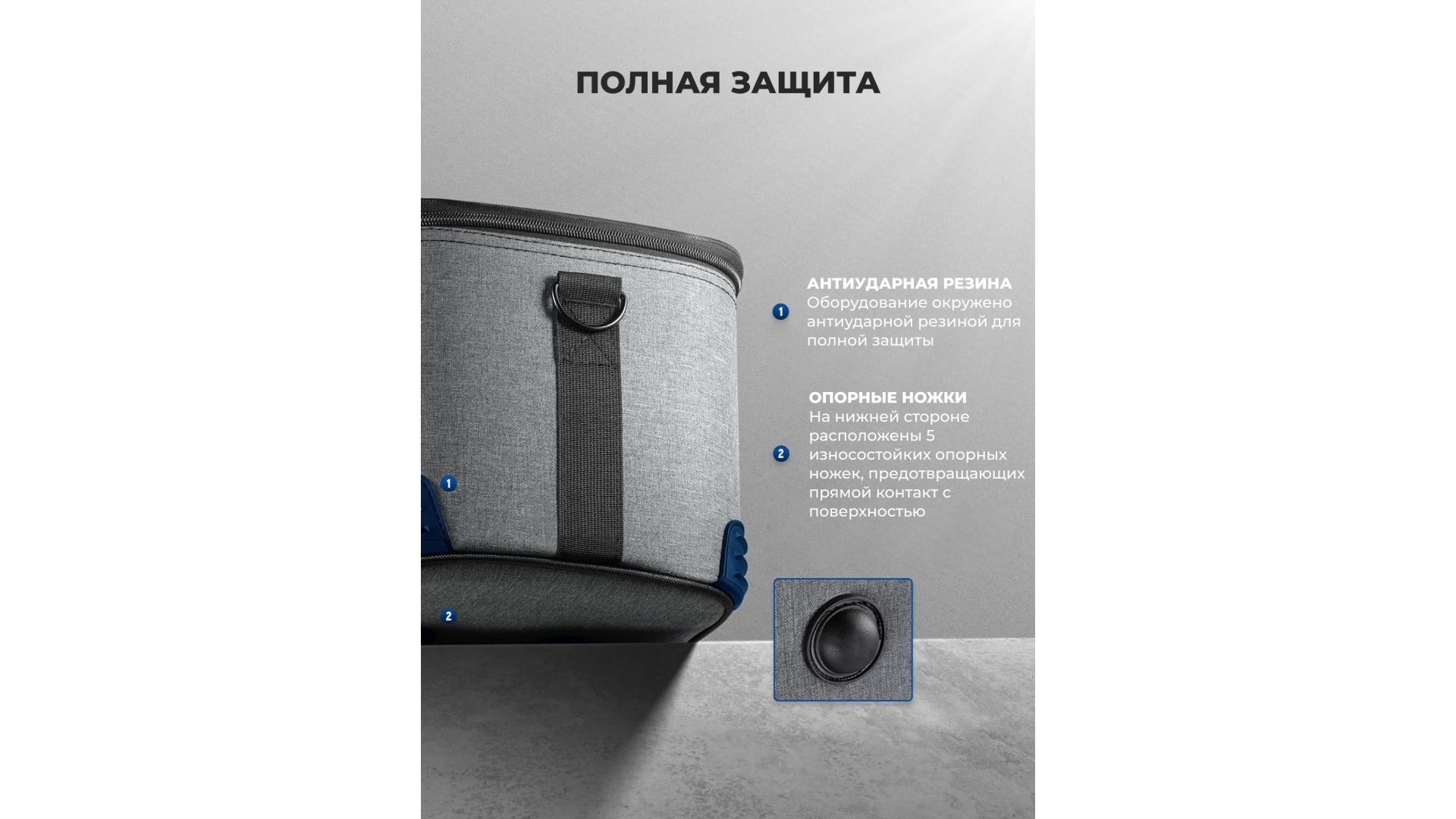 Надежная защита: Прочный корпус из оксфордской ткани и ПВХ, усиленные углы и 5 противоударных резиновых ножек.