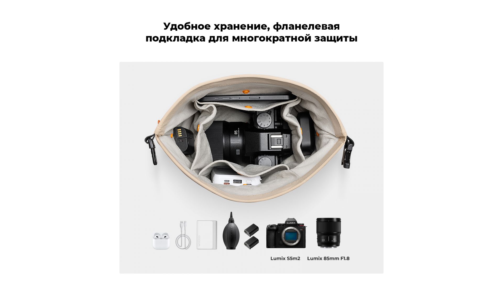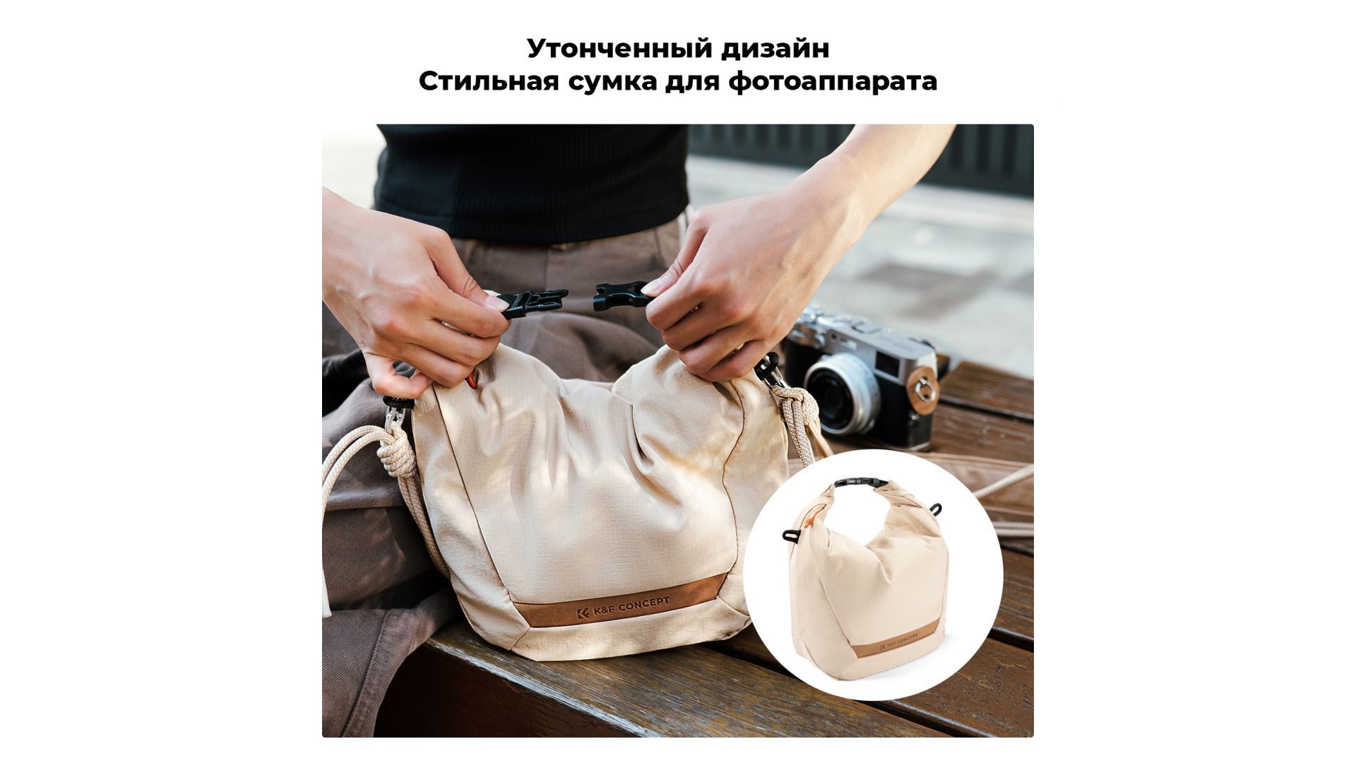 - Помещается одна камера и один объектив, может использоваться как сумка через плечо, сумка для писем, дамская сумочка, внутренний мешок