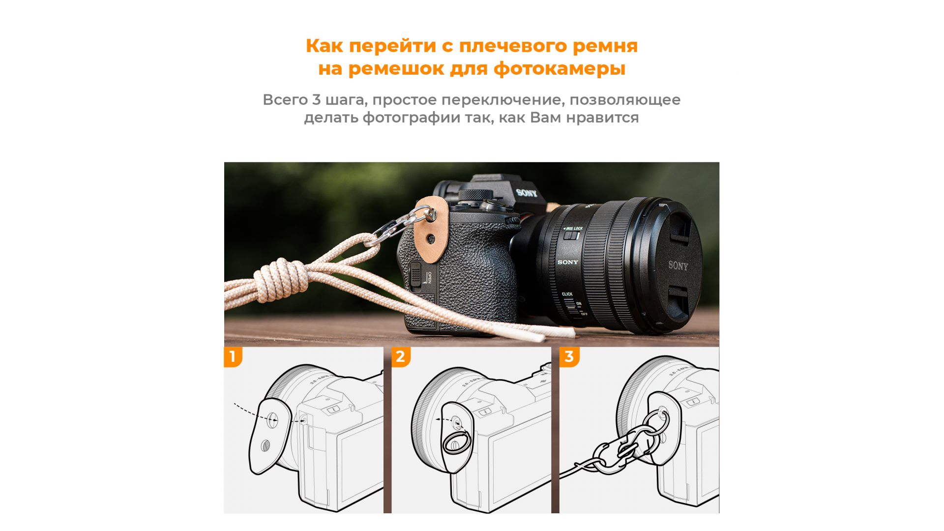 - Поставляется с нашивкой из натуральной кожи и крепежным кольцом, может использоваться как плечевой ремень для камеры (при использовании в качестве плечевого ремня вес камеры должен составлять ≤1,5 кг)