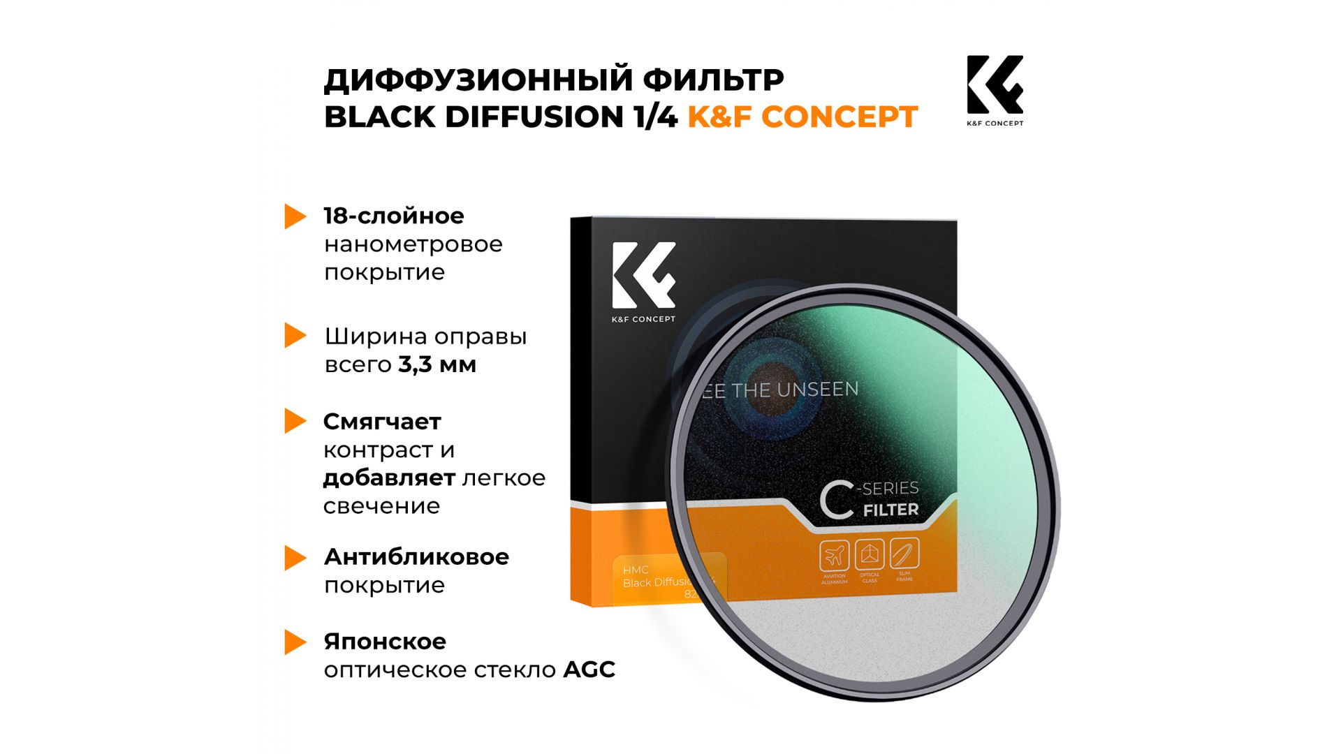 Черный диффузионный фильтр K&F Concept, изготовленный из японского оптического стекла AGC, с двойным многослойным покрытием и с коэффициентом пропускания 84%, обеспечивающим качество изображения и отсутствие цветового оттенка.