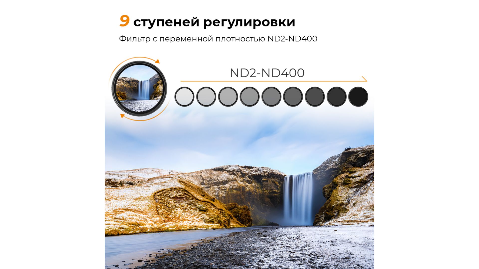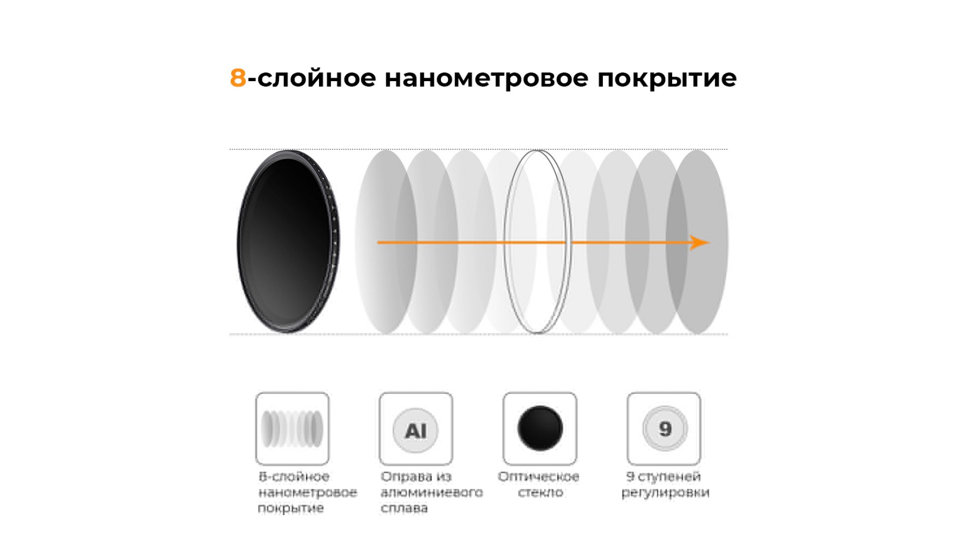 Нейтральный светофильтр позволяет снимать с необходимым для художественного эффекта значением диафрагмы, при длинной выдержке, даже солнечным днём. Для смены плотности необходимо лишь повернуть основное кольцо и подобрать необходимое значение.Чистоту кадра и высокое качество изображения обеспечивает многослойная структура линзы.