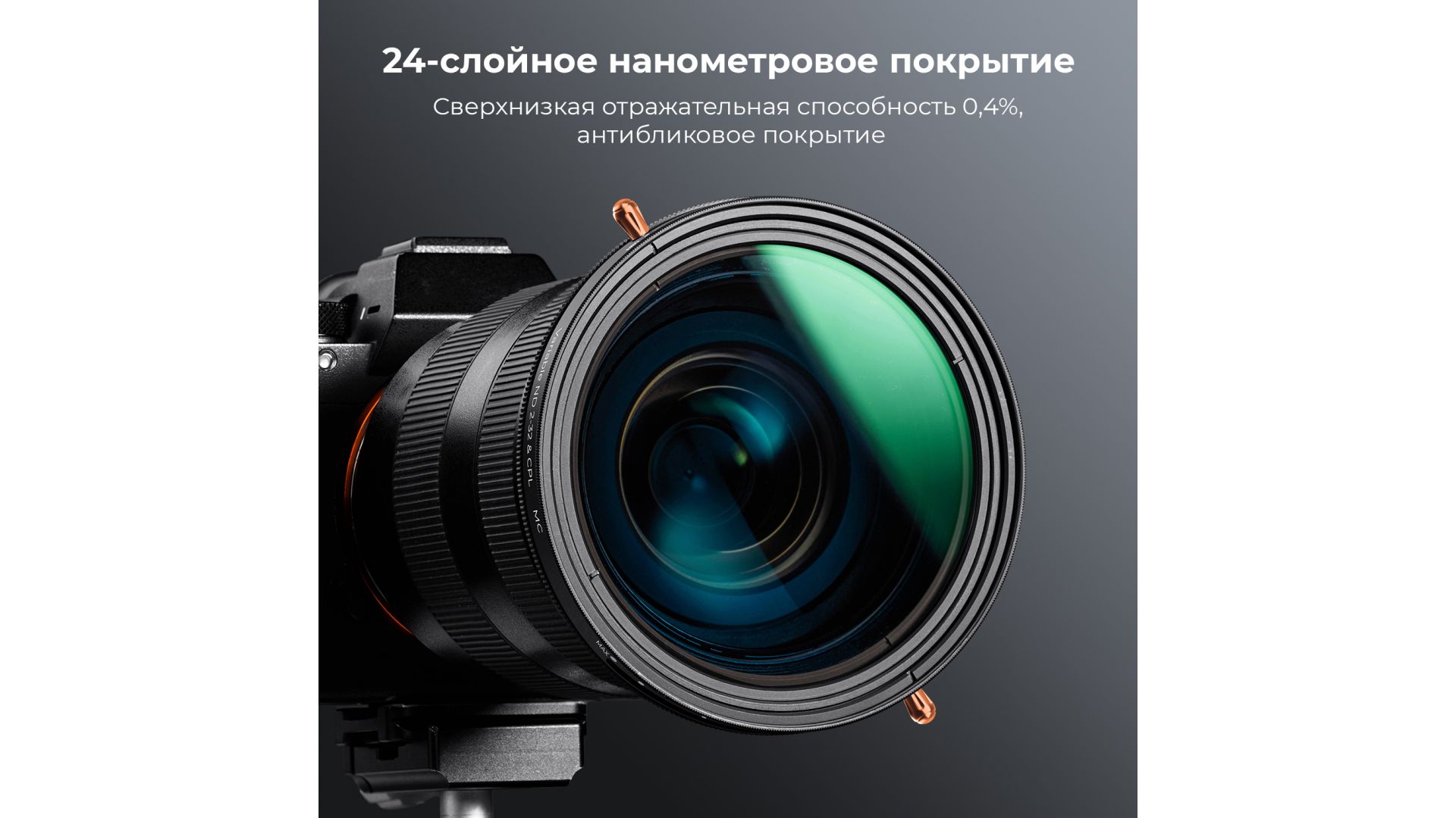 Светофильтр объектива изготовлен из высококачественного оптического стекла AGC с 24-слойным водонепроницаемым покрытием. При использовании светофильтра объектива не происходит смещения цвета и гарантируется высокое качество изображения.