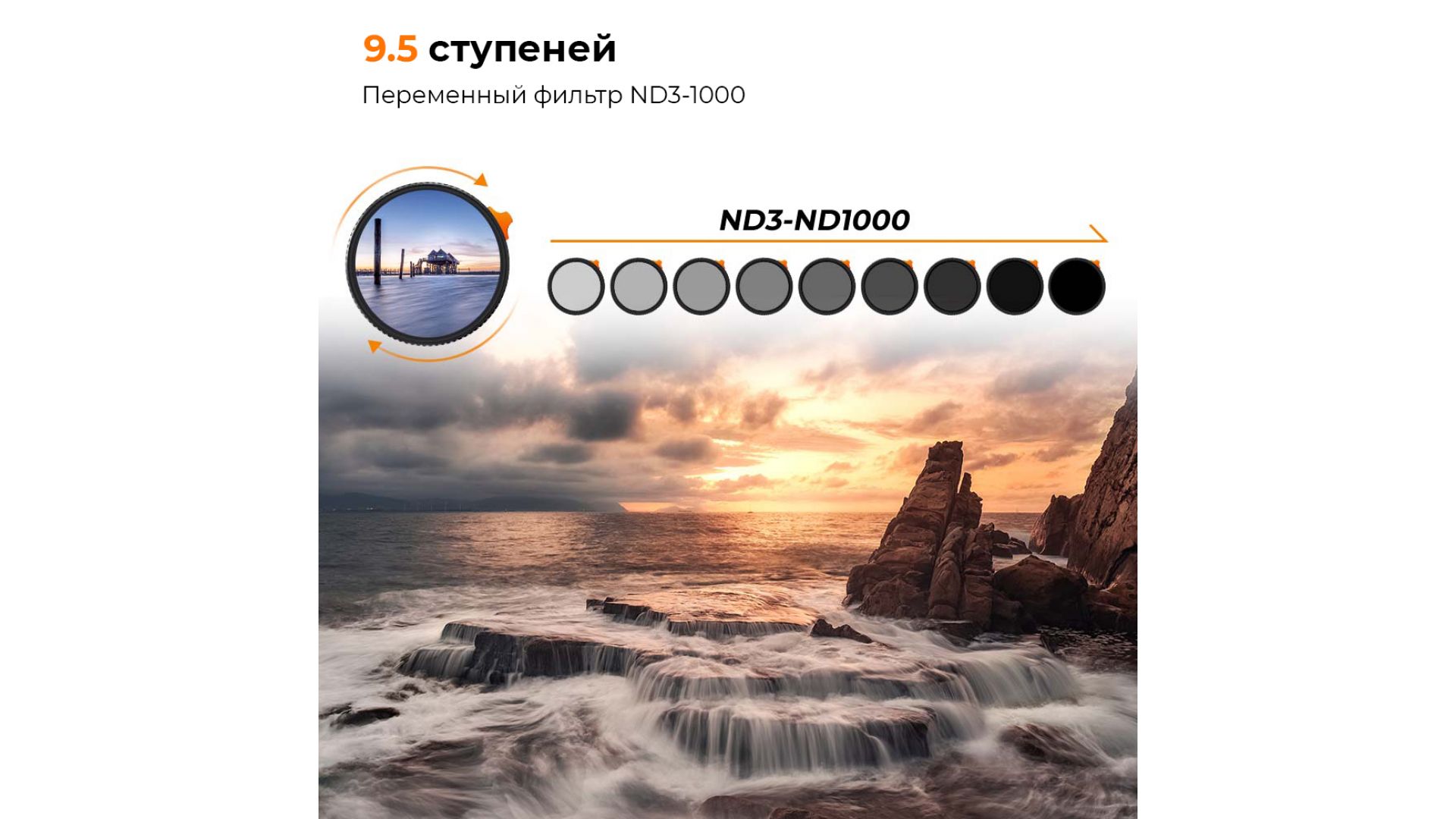 Светофильтр позволяет регулировать уровень плотности в диапазоне ND3-1000 (9,5 ступеней). Регулировать плотность можно с помощью специального толкателя в конструкции фильтра.