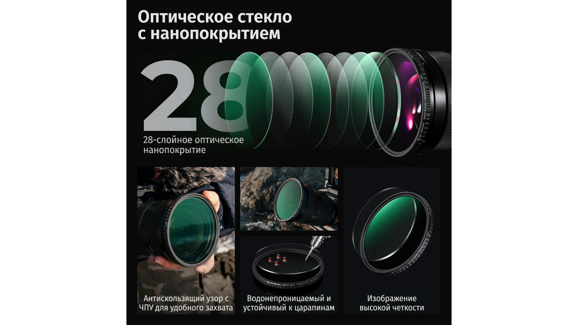 Нано-покрытие NANOTEC обладает водоотталкивающими и олеофобными свойствами: оно защищает от отпечатков пальцев, масла и царапин, обеспечивая антибликовый эффект. Ультратонкая оправа из авиационного алюминия предотвращает виньетирование и устойчива к заклиниванию. Идеальное решение для съемки видео, пейзажей и длинных выдержек.