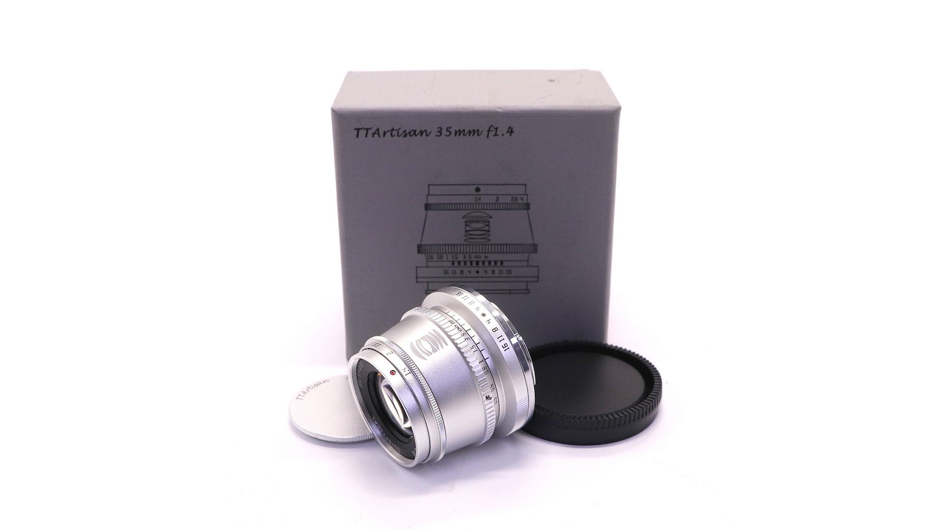 Объектив 35/1.4 производителя TTArtisan в серебряном цвете. Представляет собой объектив для беззеркальных кроп-камер с сенсором APS-C для Sony E.