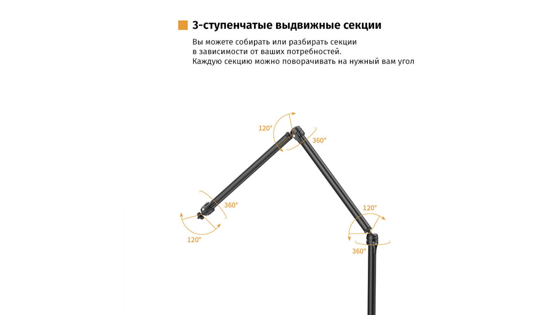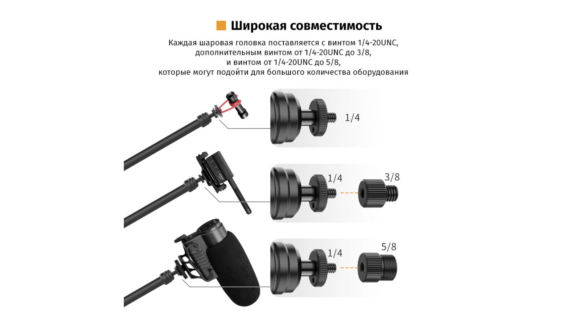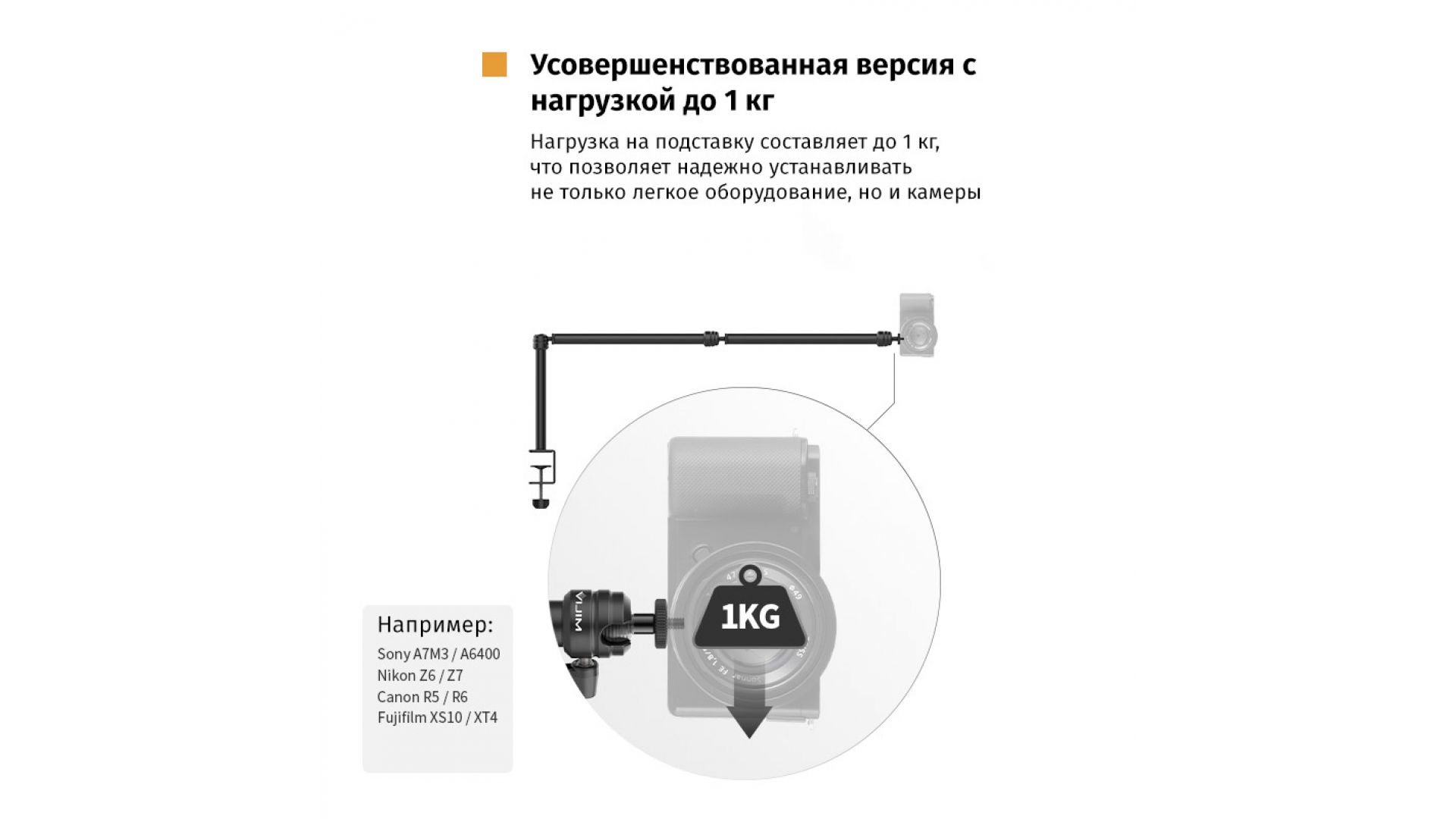 Каждый кронштейн оснащён надёжным зажимом и шаровой головкой, выдерживающей нагрузку до 1 кг, что обеспечивает стабильное позиционирование оборудования. Удлинитель совместим со стойками и направляющими толщиной 18–28 мм. В комплекте идёт винт 1/4" для крепления камеры и аксессуаров.