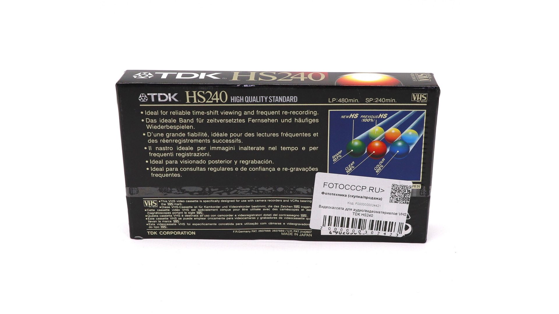 – Технические преимущества: оптимизированный магнитный слой для чёткой картинки и чистого звука; низкий уровень фоновых шумов; полная совместимость со всеми VHS‑видеомагнитофонами и камерами; время записи — 240 мин в режиме SP.